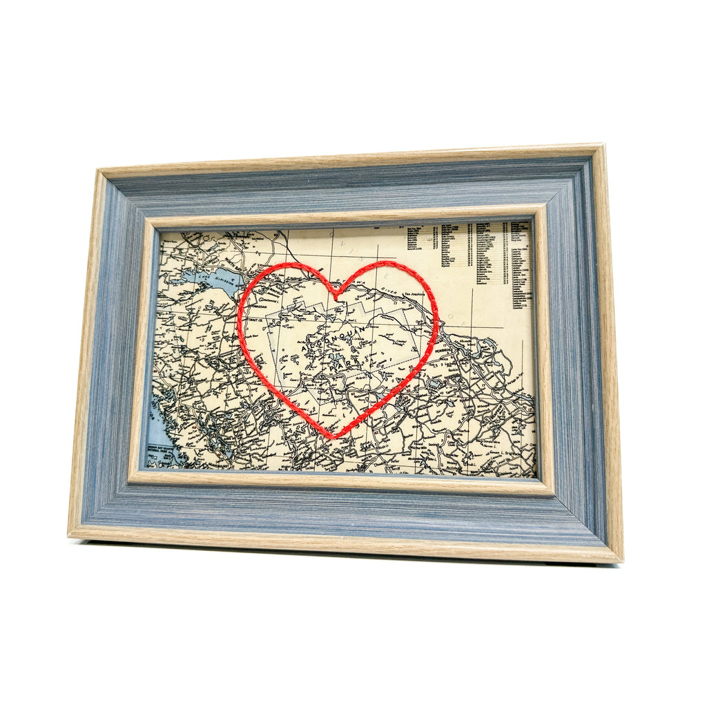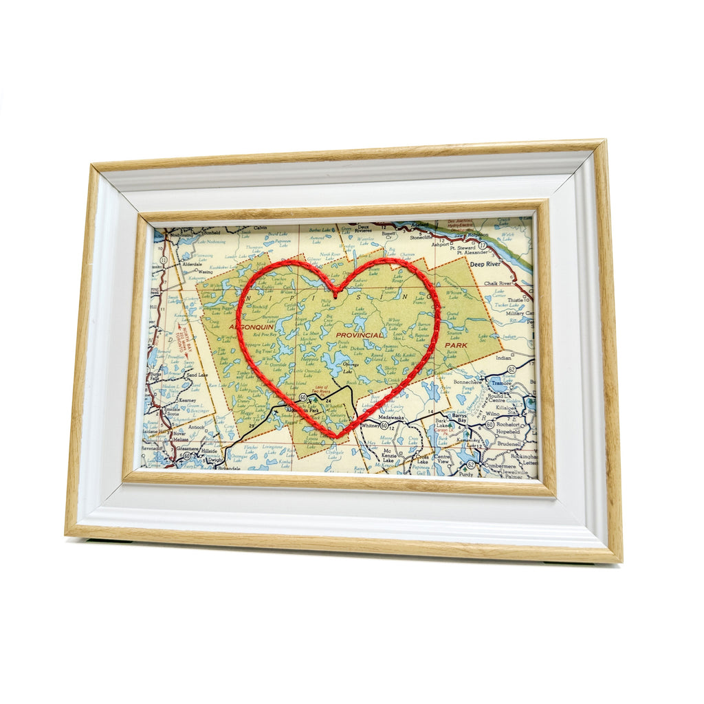 This vintage Algonquin Park map print has been hand-embroidered with a red heart that symbolizes the places, people, and adventures you hold dear.
