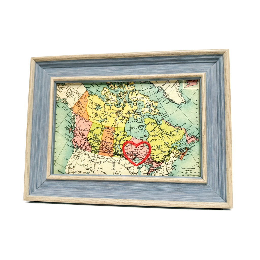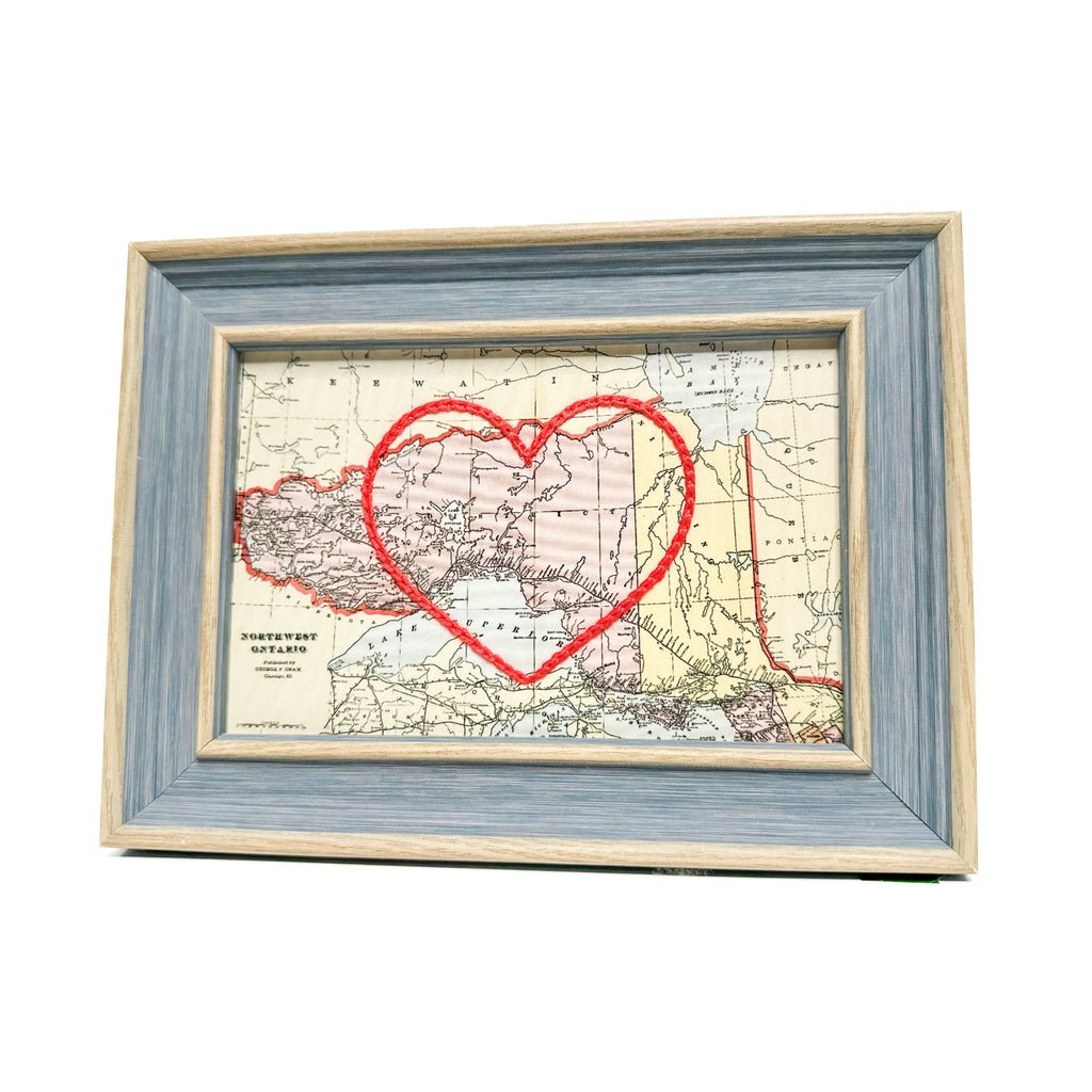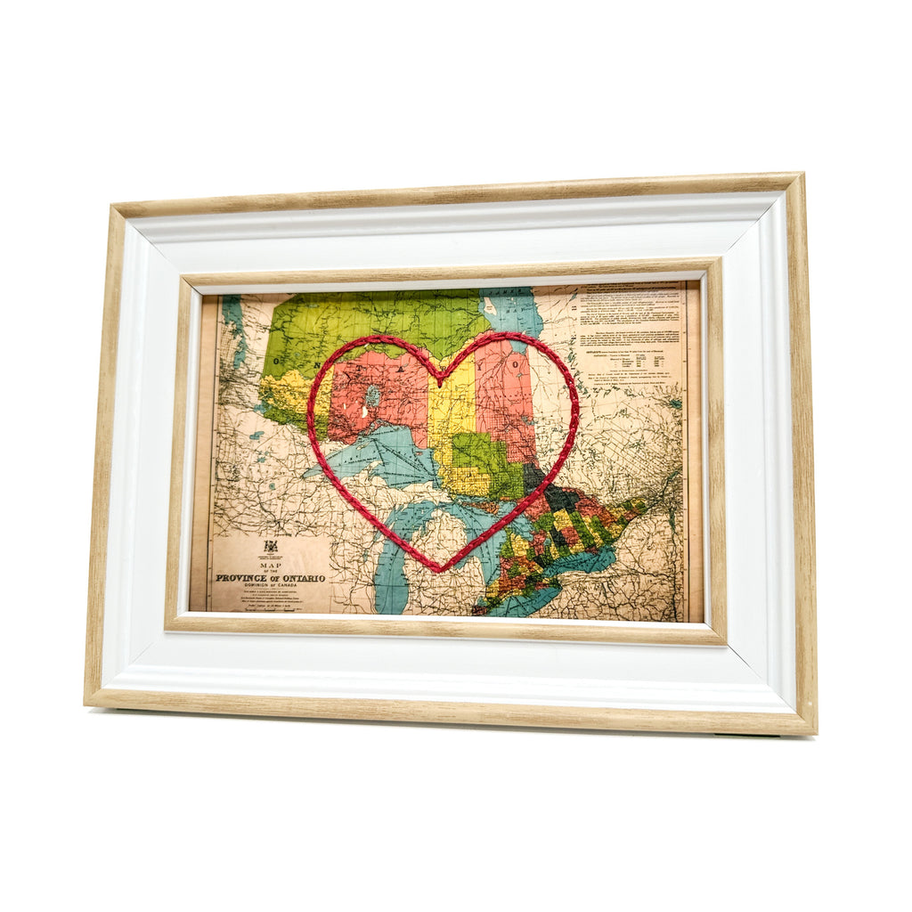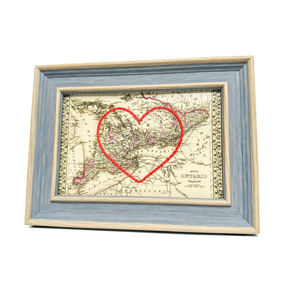This vintage Ontario map print has been hand-embroidered with a red heart that symbolizes the places, people, and adventures you hold dear.