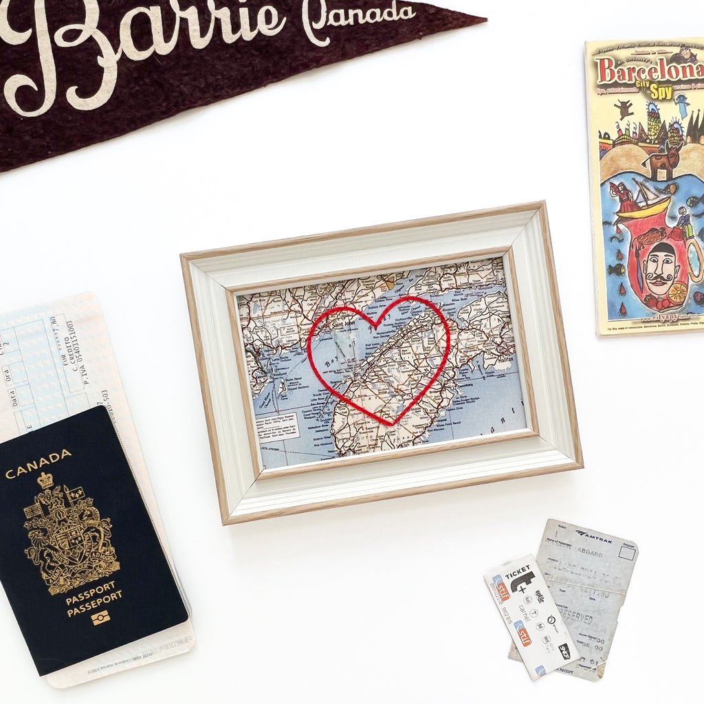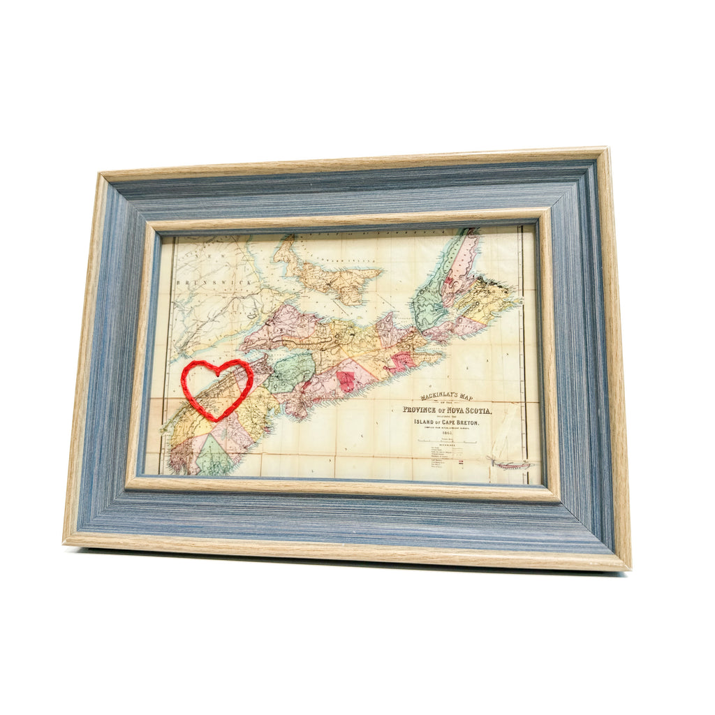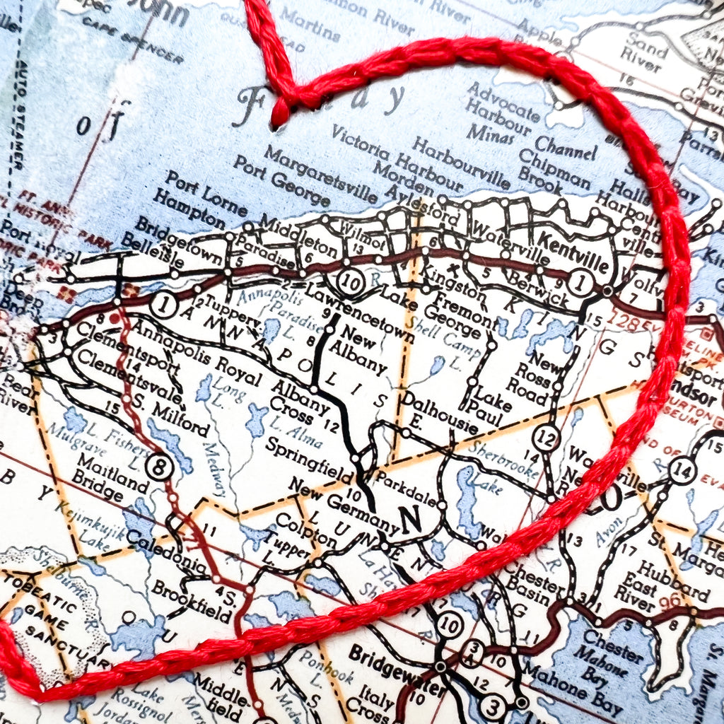 This vintage Annapolis Valley, Nova Scotia map print has been hand-embroidered with a red heart that symbolizes the places, people, and adventures you hold dear.
