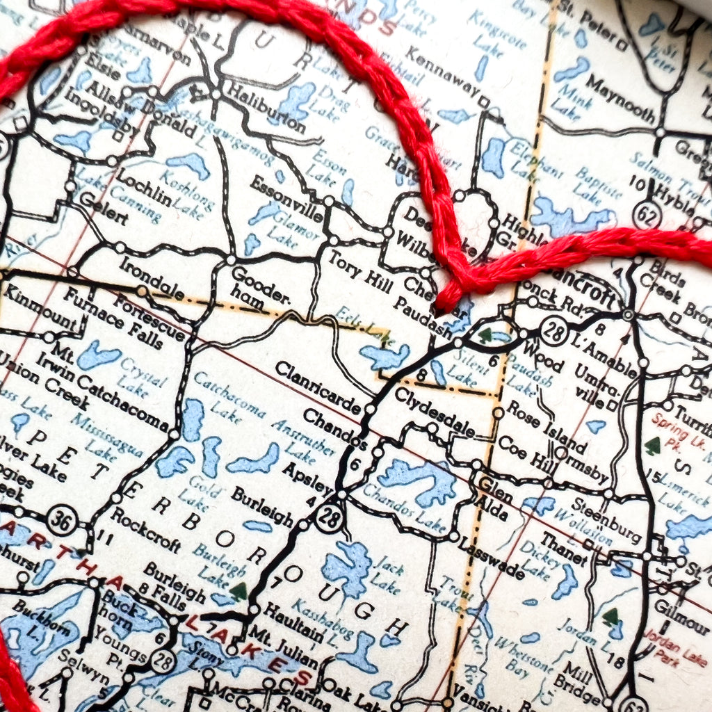 This vintage Apsley, Ontario map print has been hand-embroidered with a red heart that symbolizes the places, people, and adventures you hold dear.