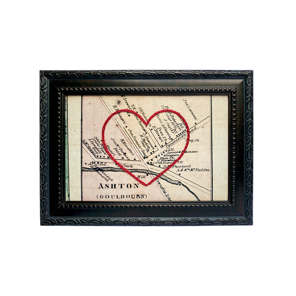 This vintage Ashton, Ontario map print has been hand-embroidered with a red heart that symbolizes the places, people, and adventures you hold dear.