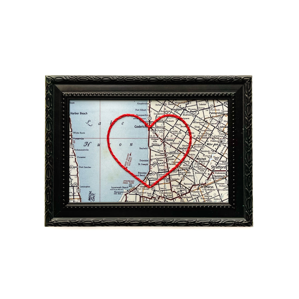 This vintage Bayfield, Ontario map print has been hand-embroidered with a red heart that symbolizes the places, people, and adventures you hold dear.