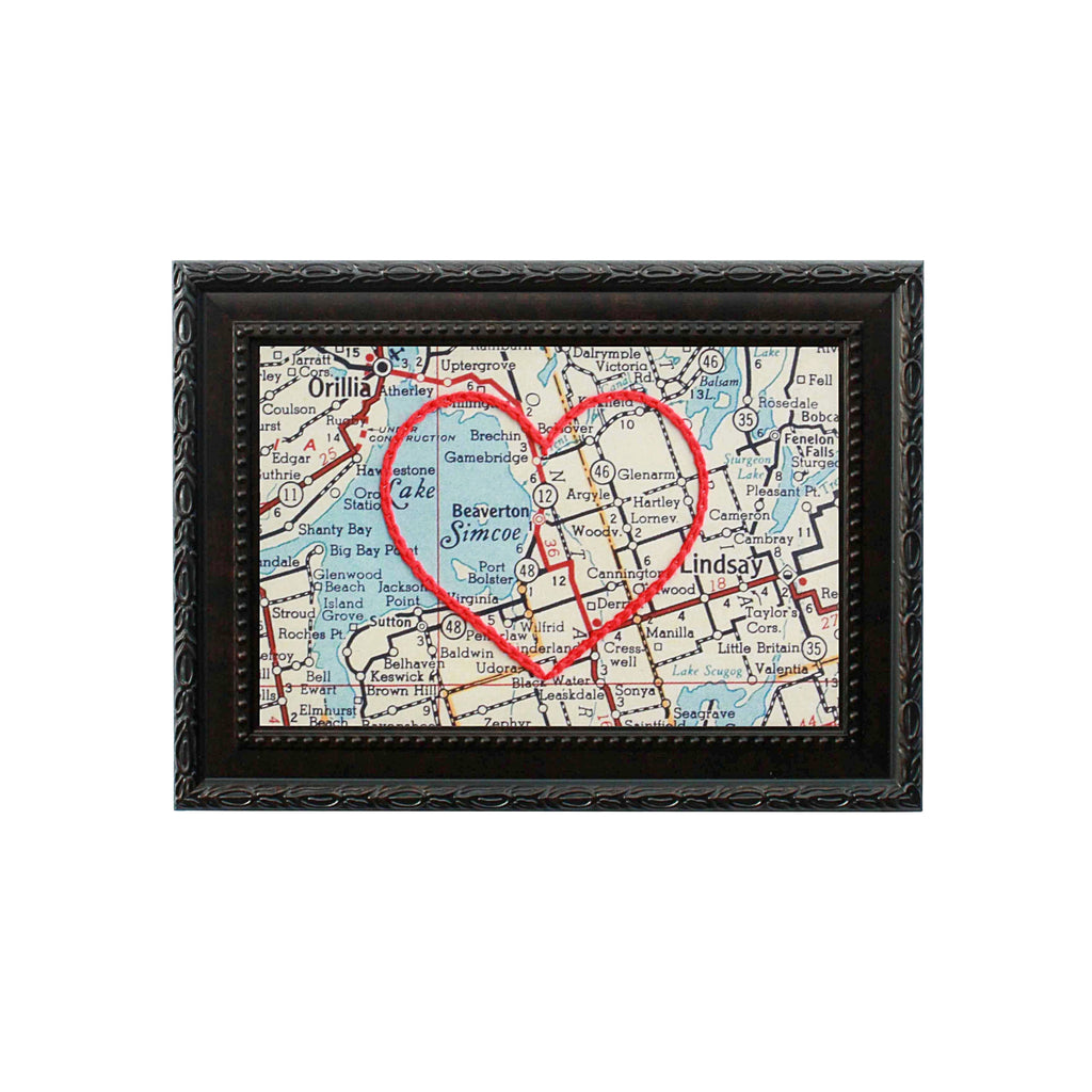 This vintage Beaverton, Ontario map print has been hand-embroidered with a red heart that symbolizes the places, people, and adventures you hold dear.