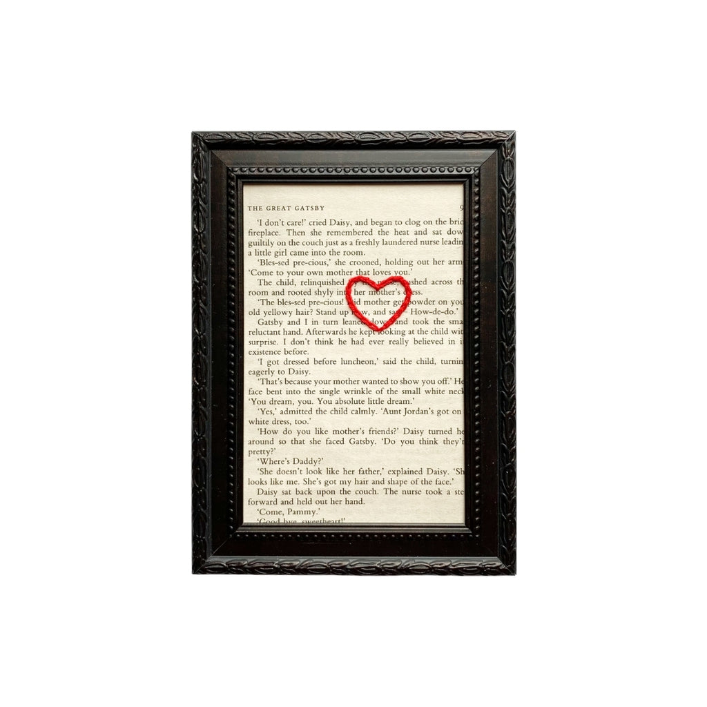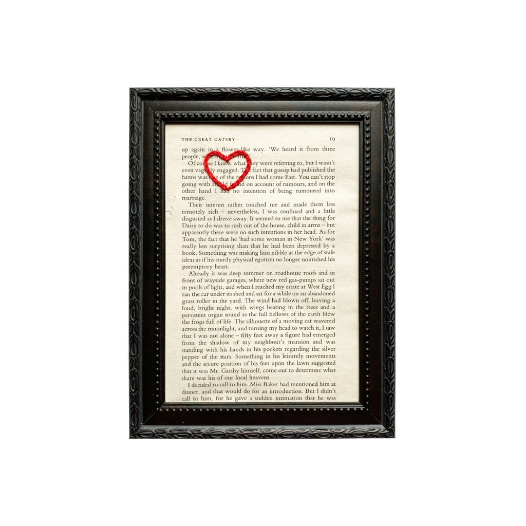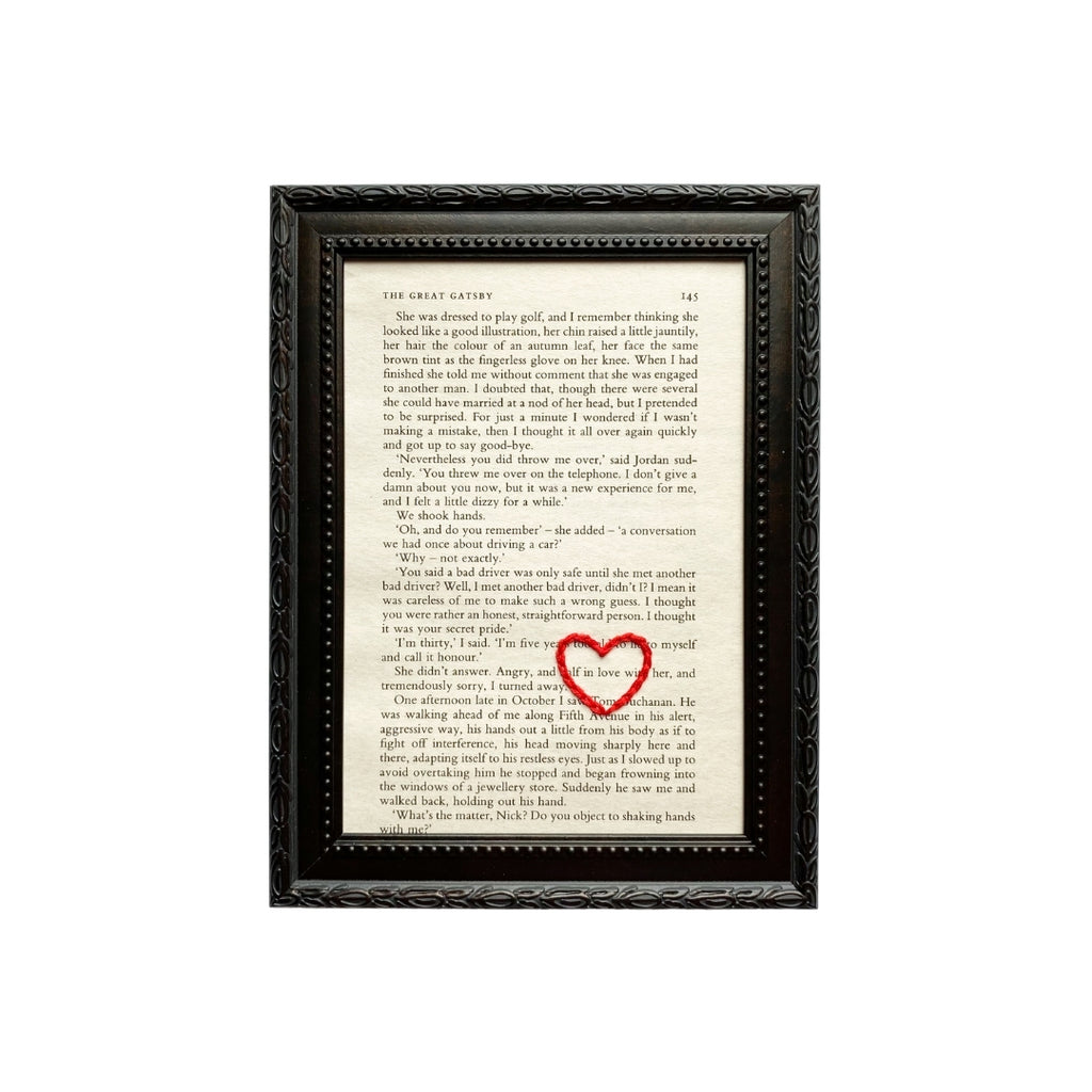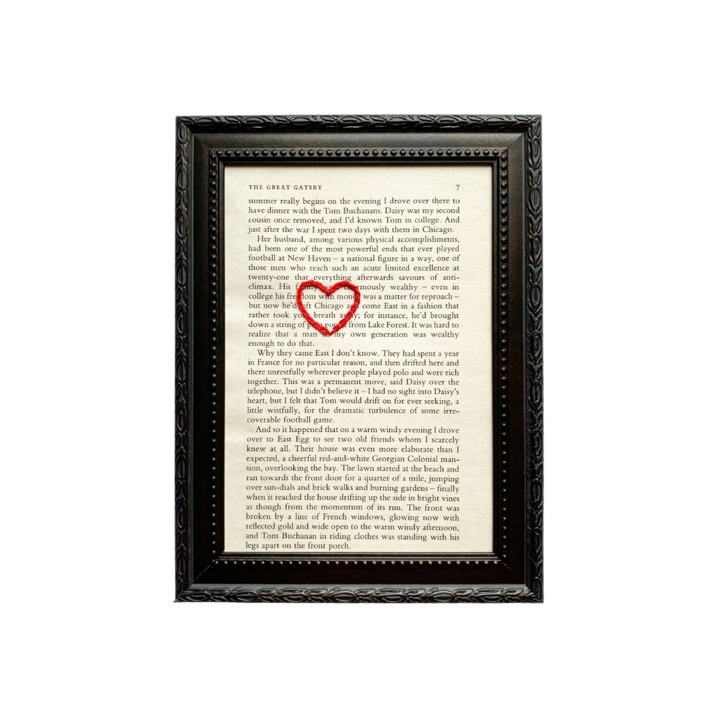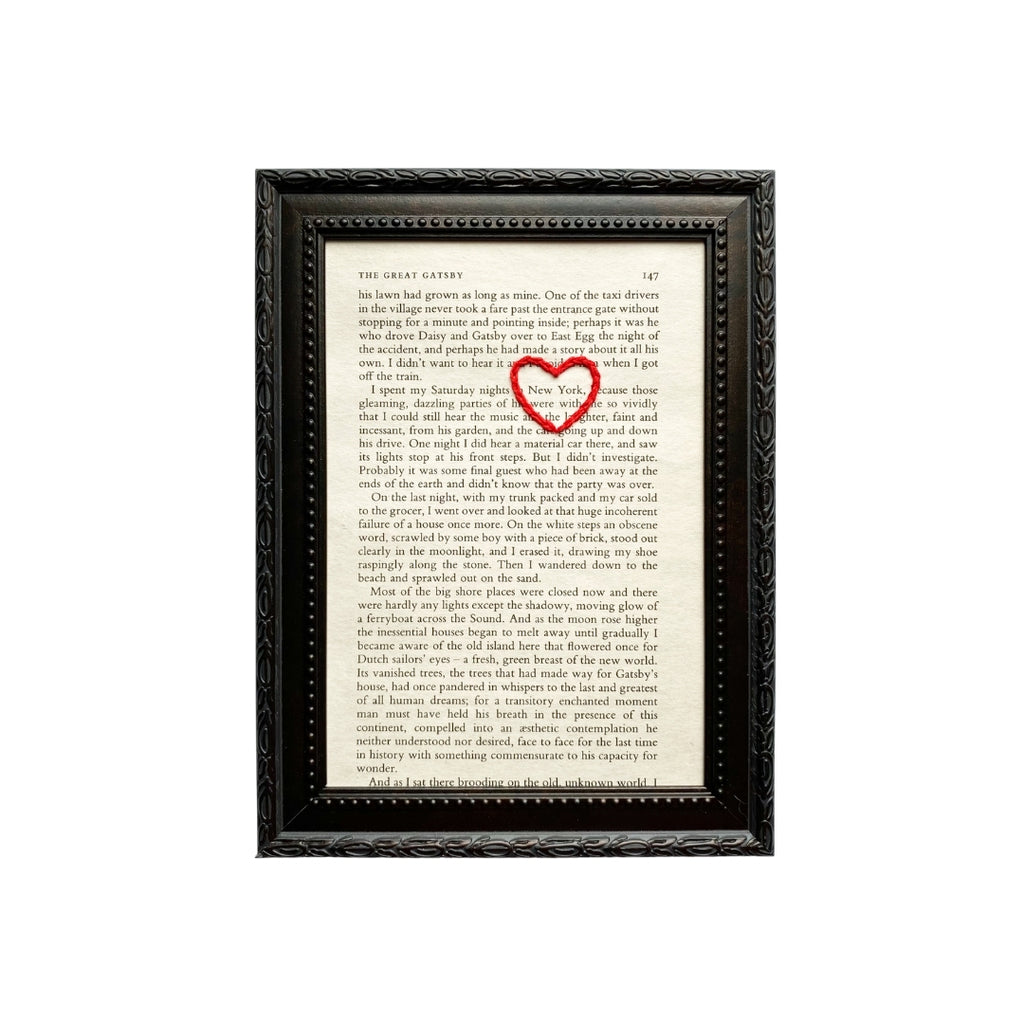 These book pages from 'The Great Gatsby' have been hand-embroidered with a heart around a certain word - making a unique piece of decor for your home.