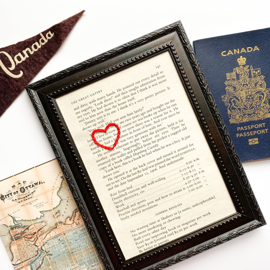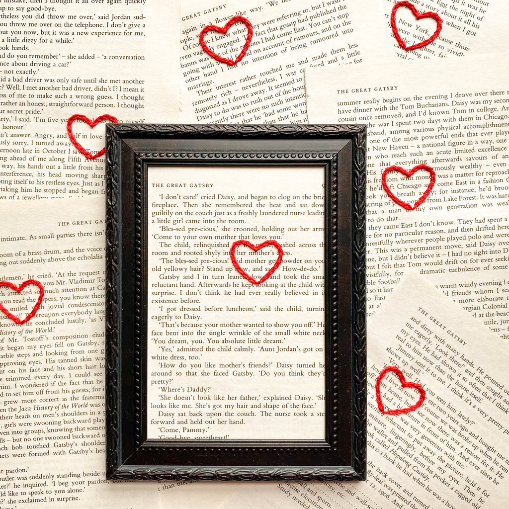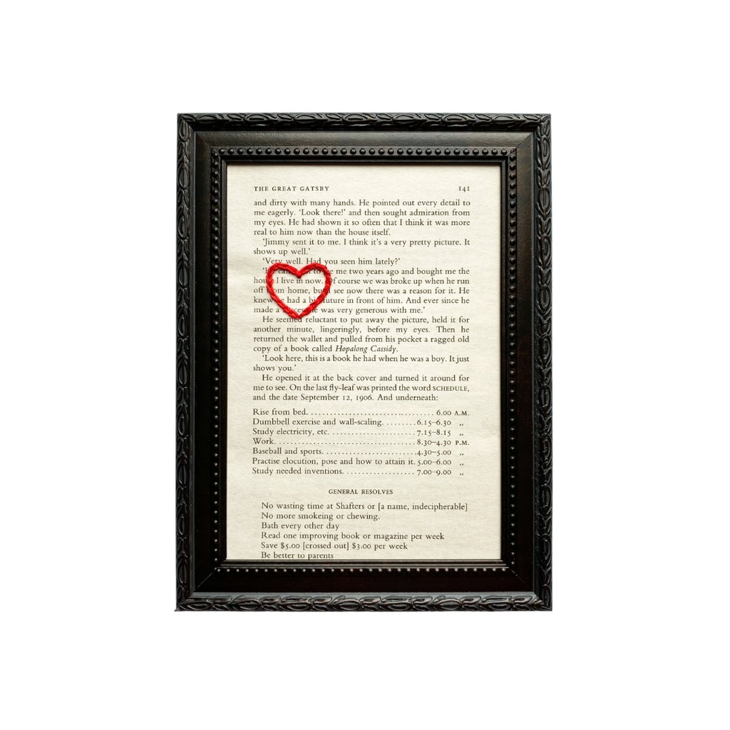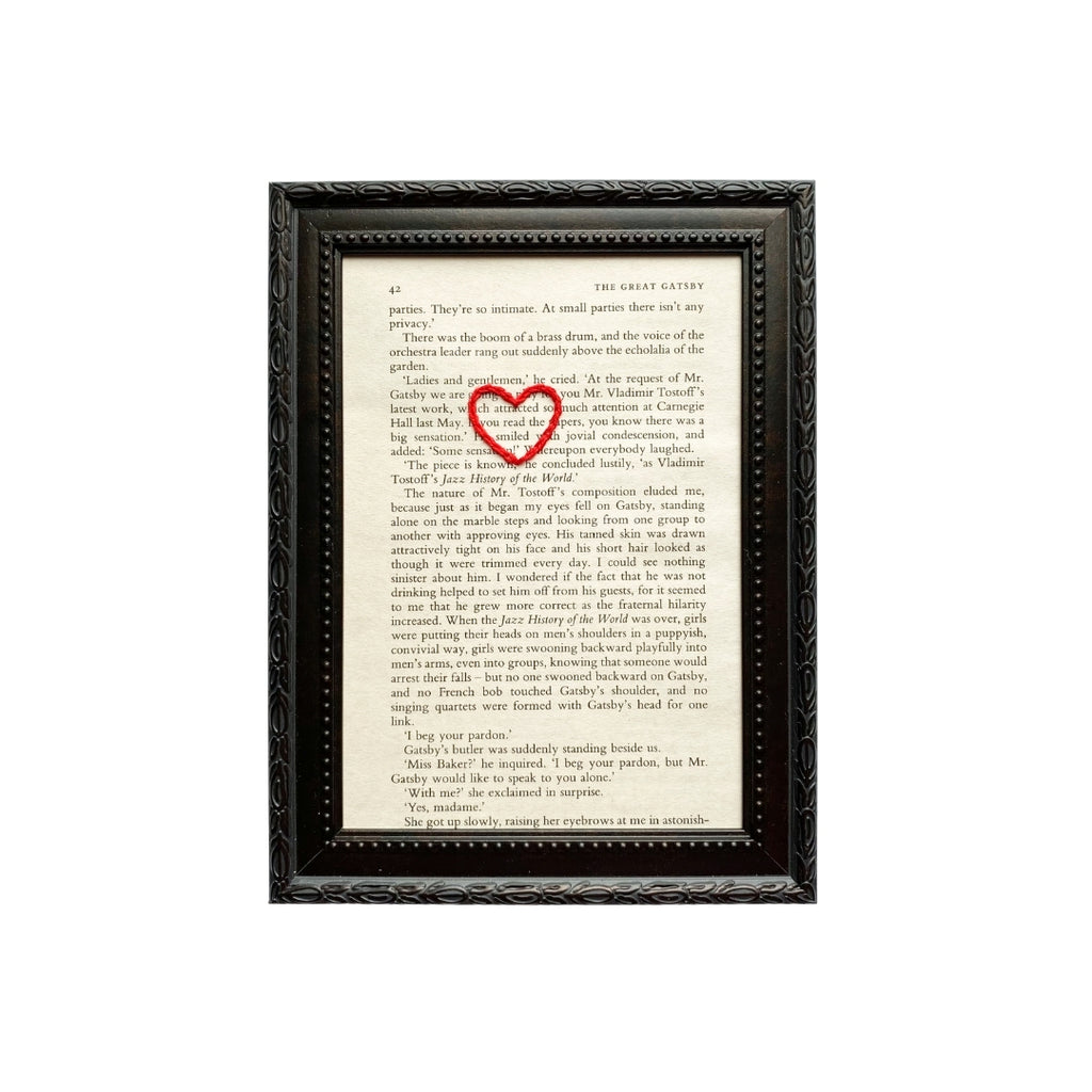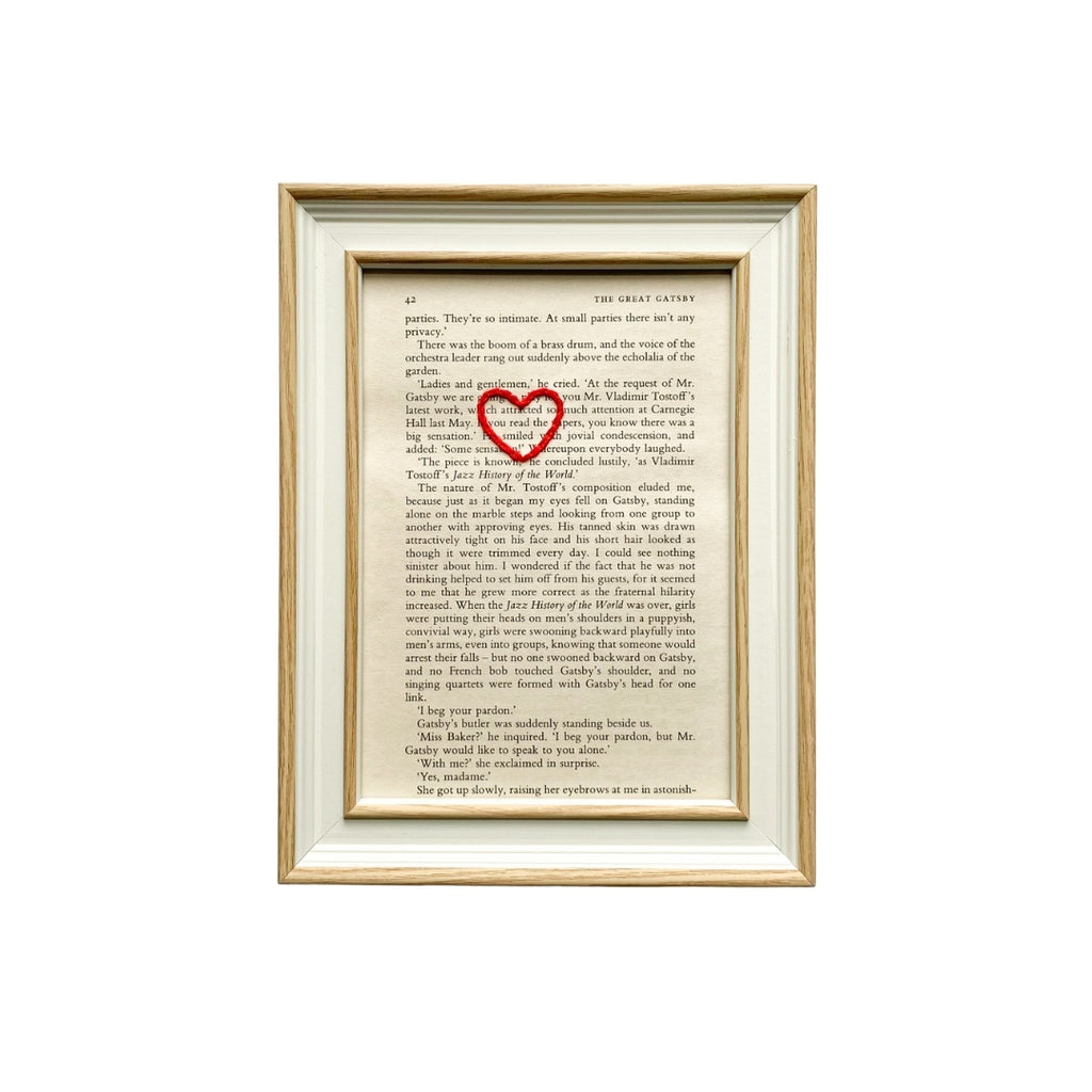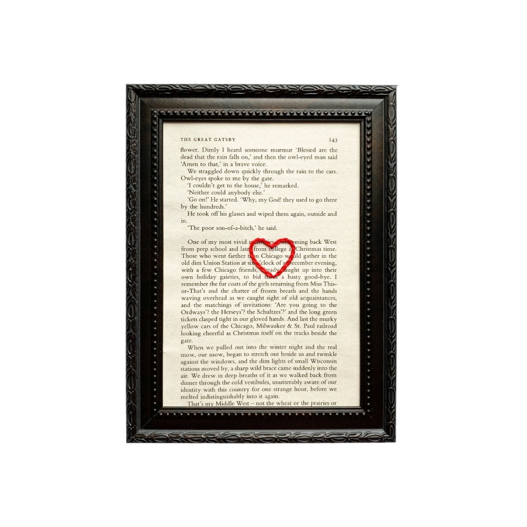 These book pages from 'The Great Gatsby' have been hand-embroidered with a heart around a certain word - making a unique piece of decor for your home.