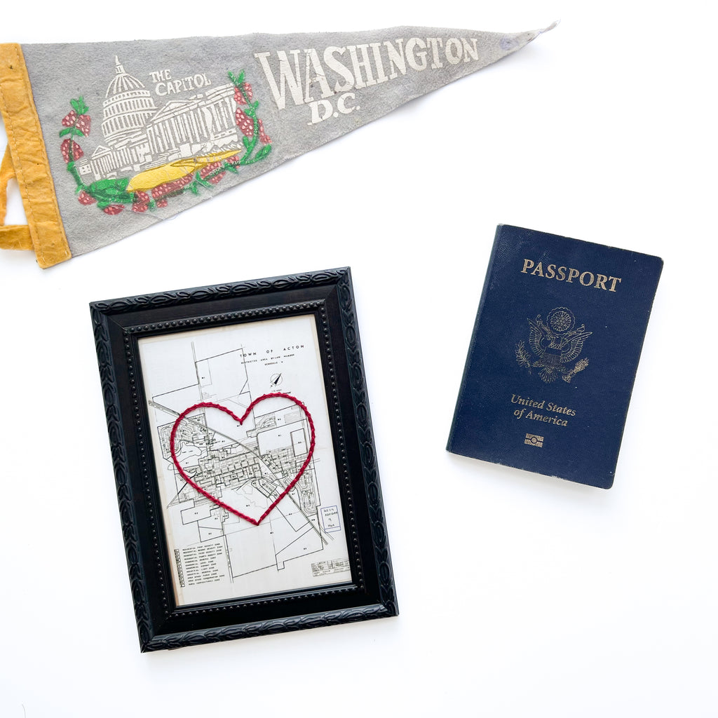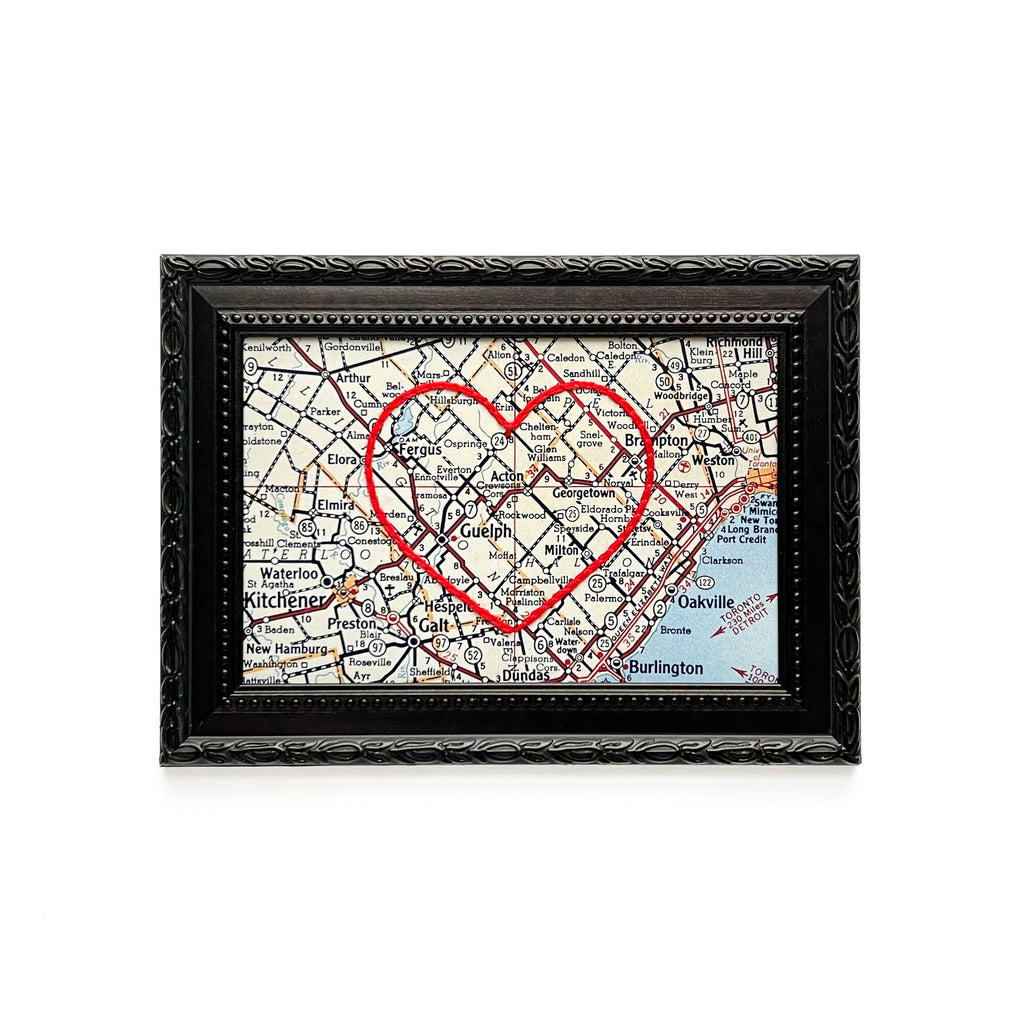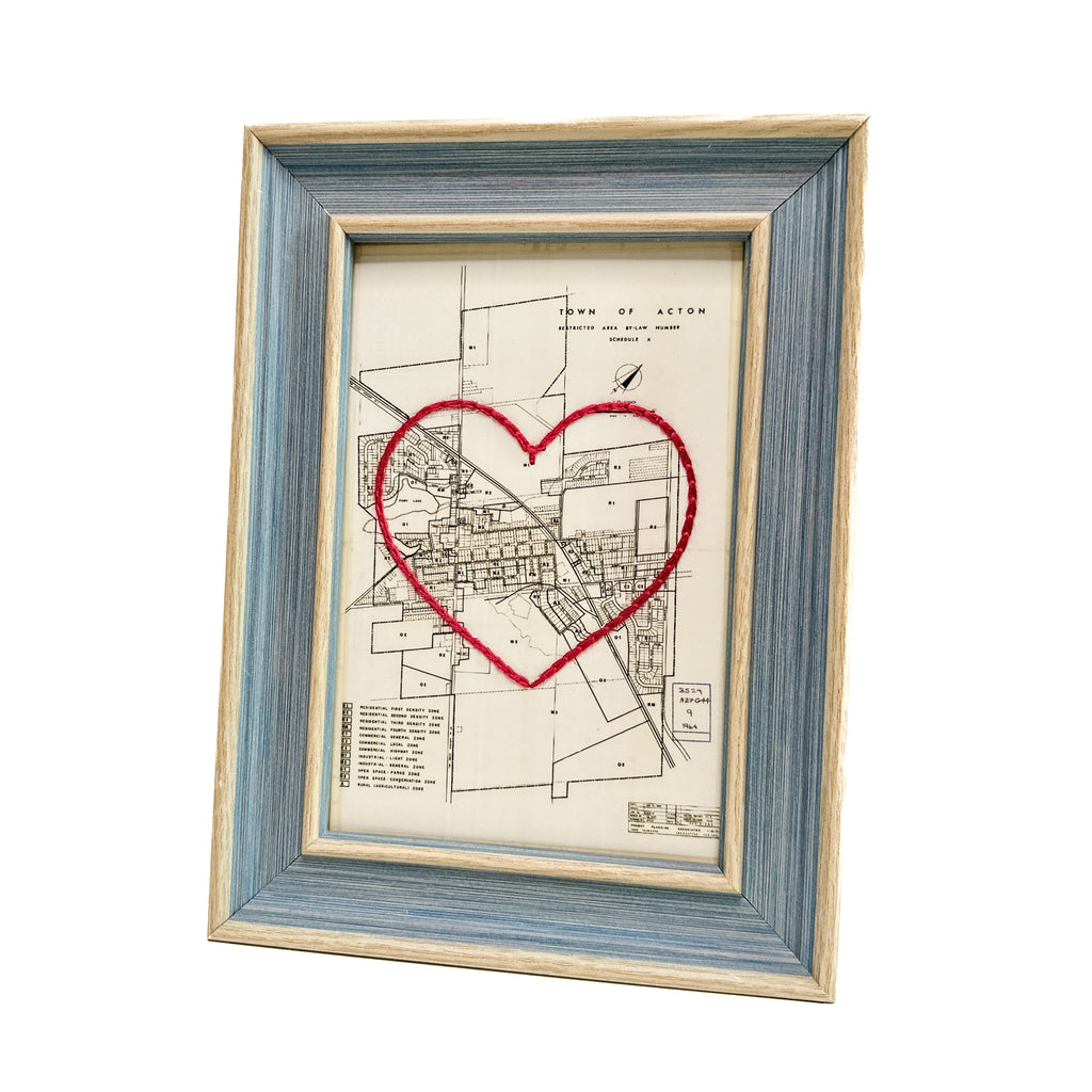 This vintage Acton, Ontario map print has been hand-embroidered with a red heart that symbolizes the places, people, and adventures you hold dear.