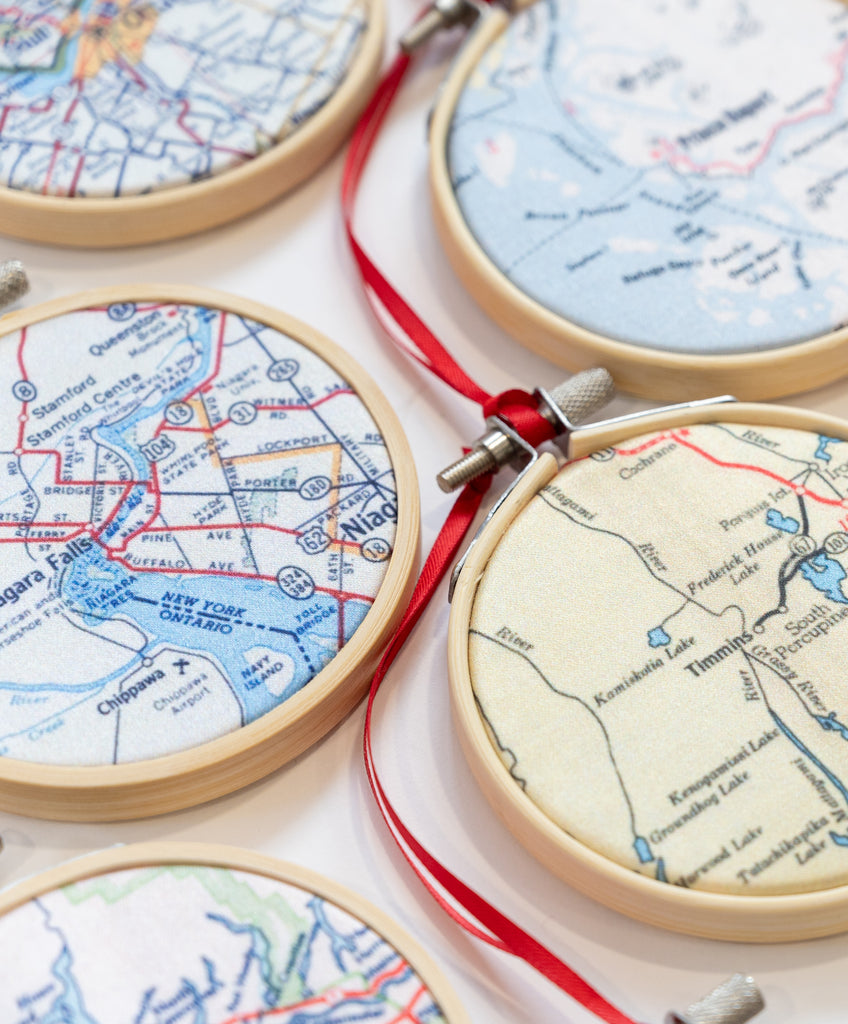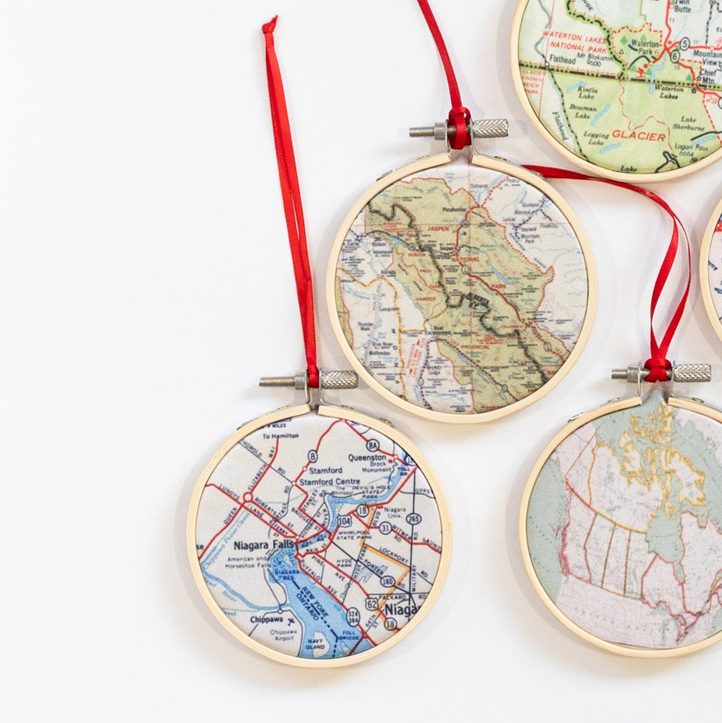 This 3" embroidery hoop features a fabric-printed map of Niagara Falls hung with a satin ribbon.