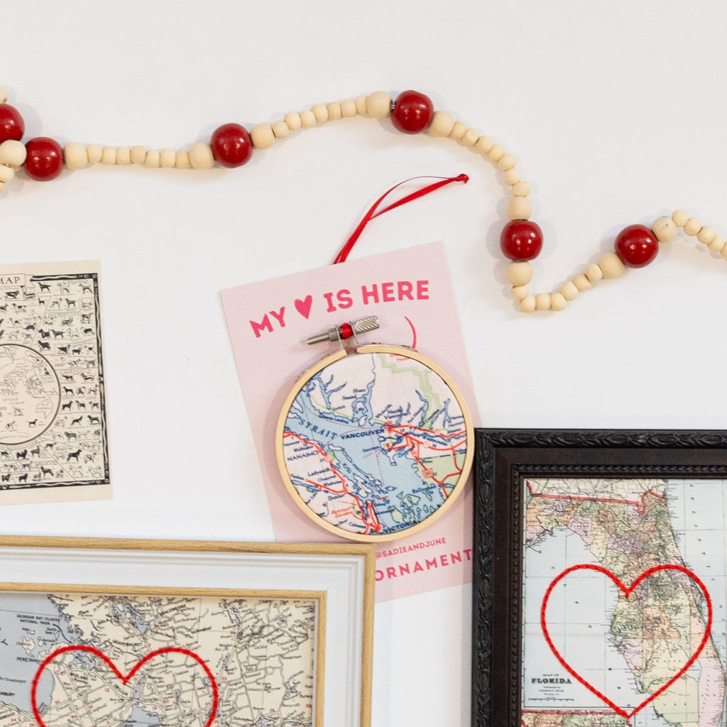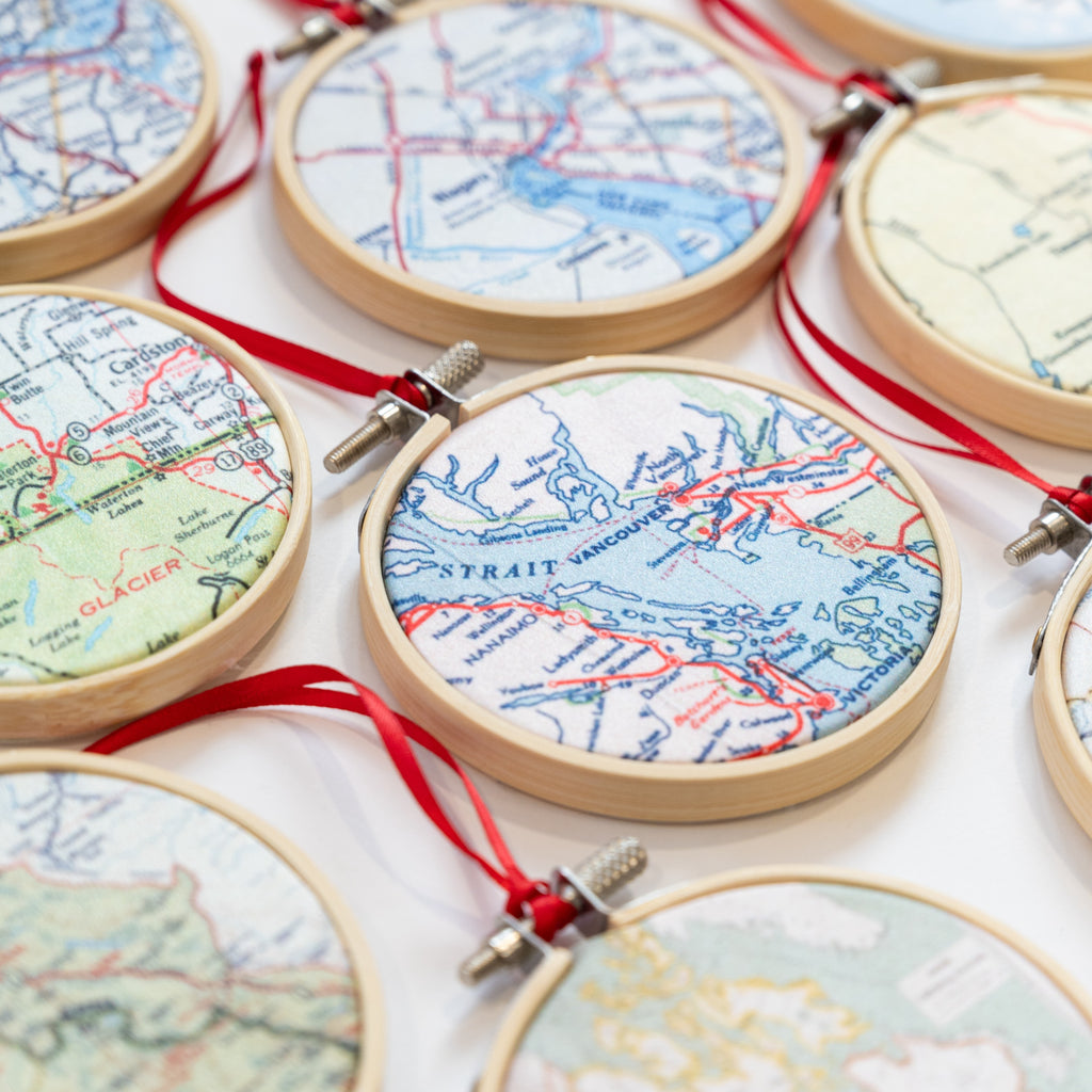 This 3" embroidery hoop features a fabric-printed map of Vancouver hung with a satin ribbon.
