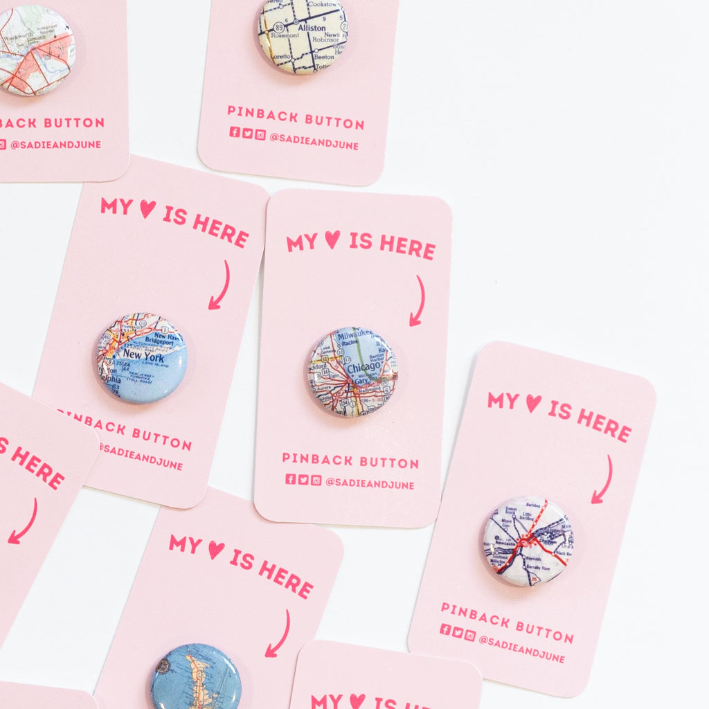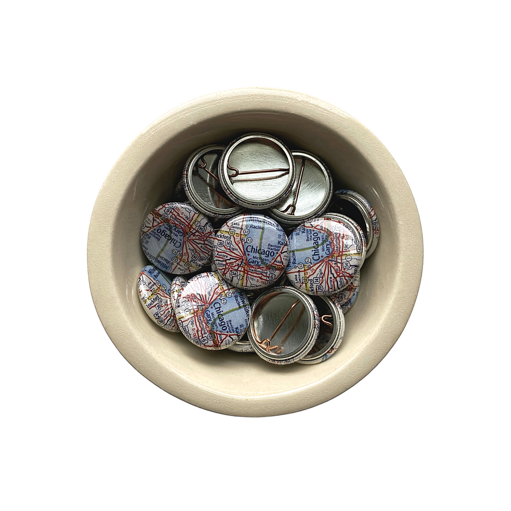 This pin is 1" and features a map of Chicago, Illinois, and the surrounding cities.