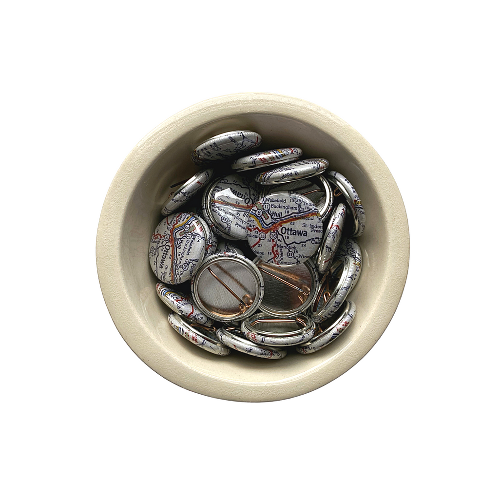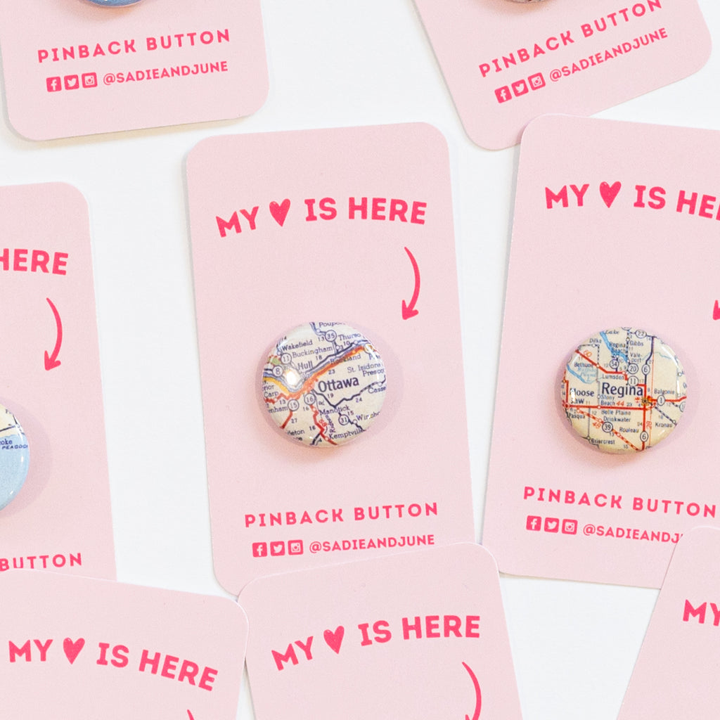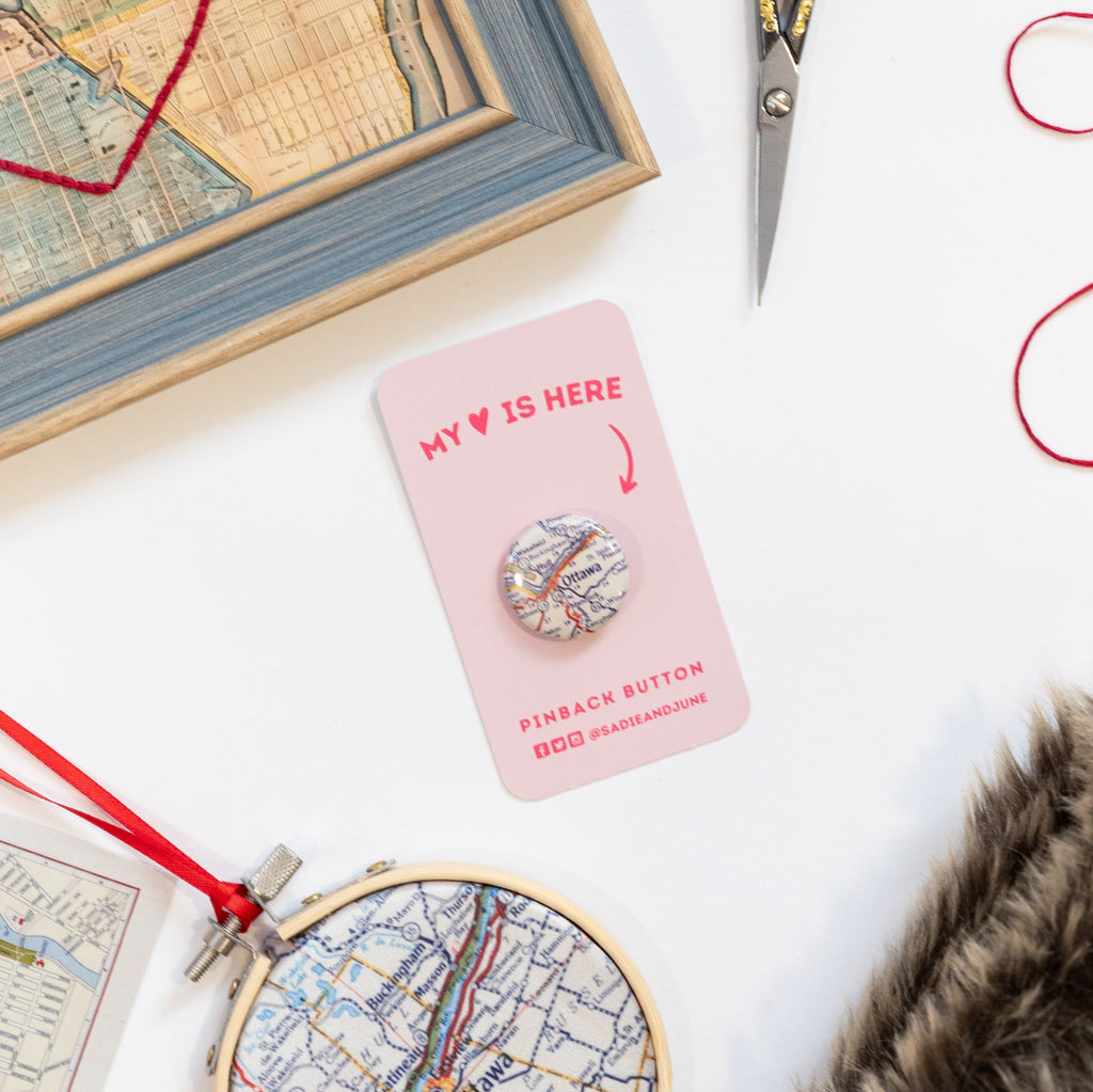 This pin is 1" and features a map of Ottawa, Ontario and the surrounding cities, and a "My Heart is Here" card backing.