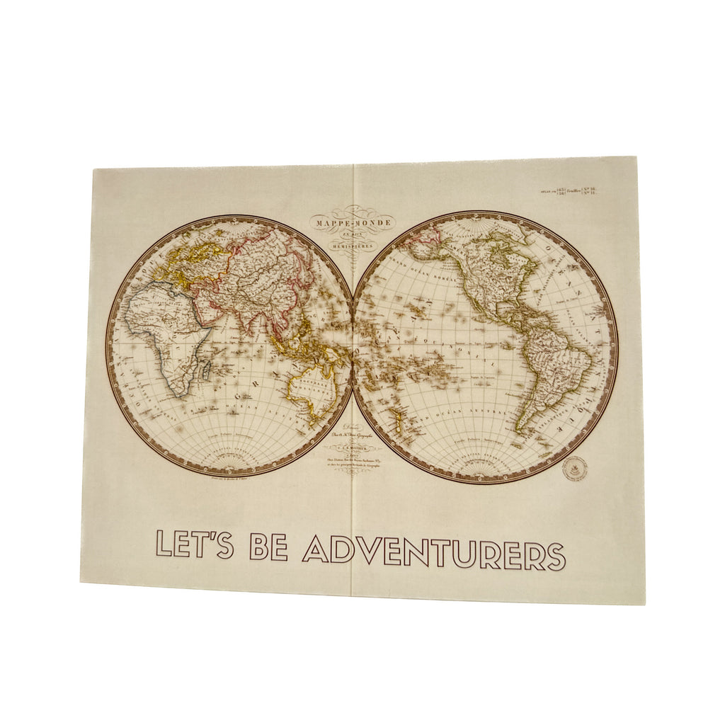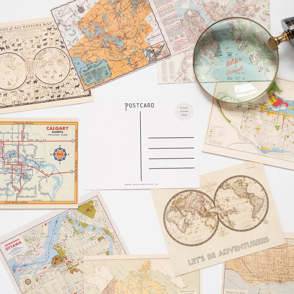The postcard is 4.25" x 5.5" and features a vintage world map with "Let's Be Adventurers."