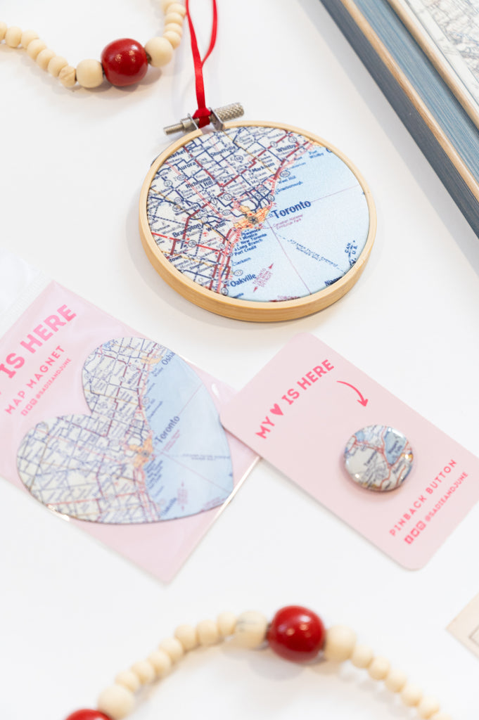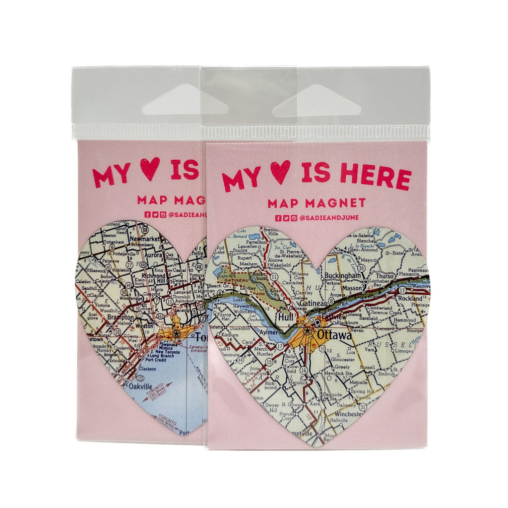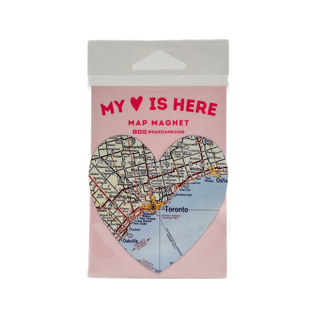 This heart-shaped magnet features a map of Toronto, Ontario and the surrounding cities, and a card backing that says "My Heart is Here."