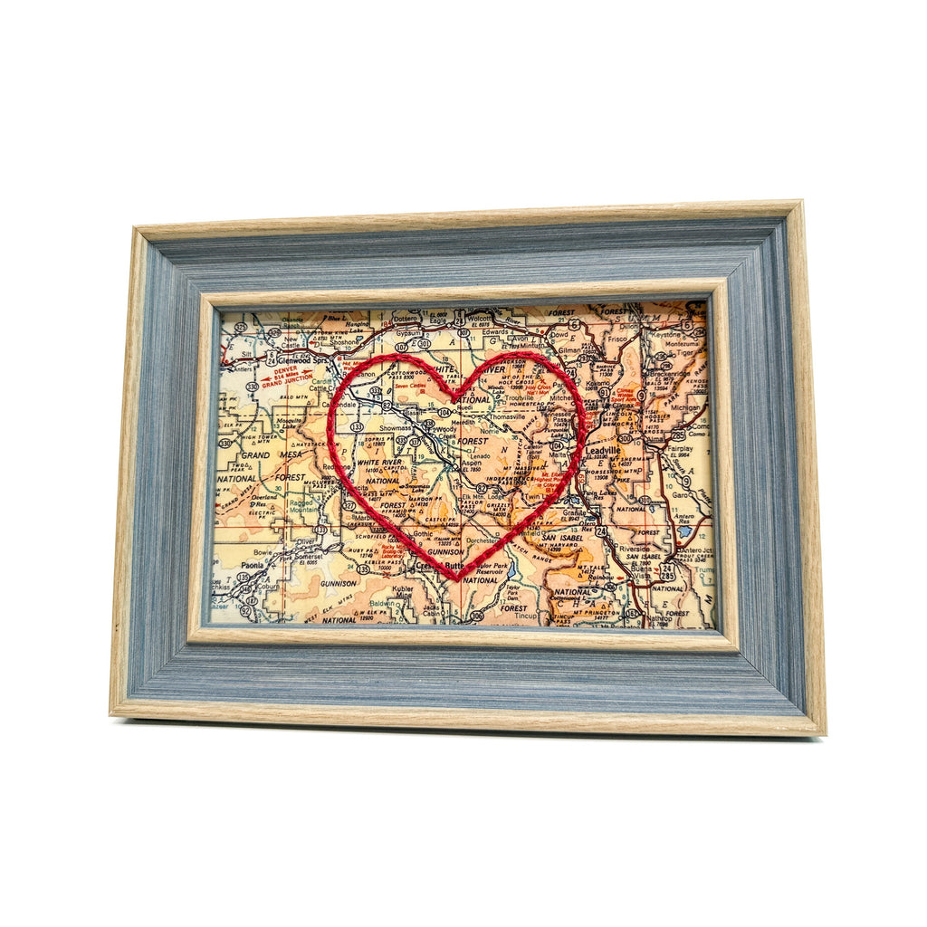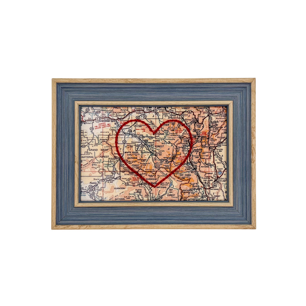 This vintage Aspen, Colorado map print has been hand-embroidered with a red heart that symbolizes the places, people, and adventures you hold dear.