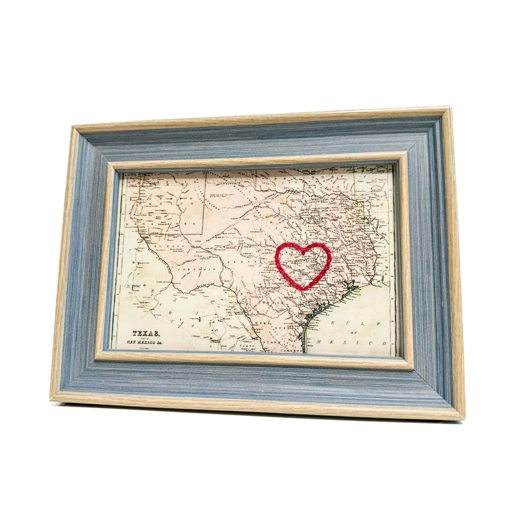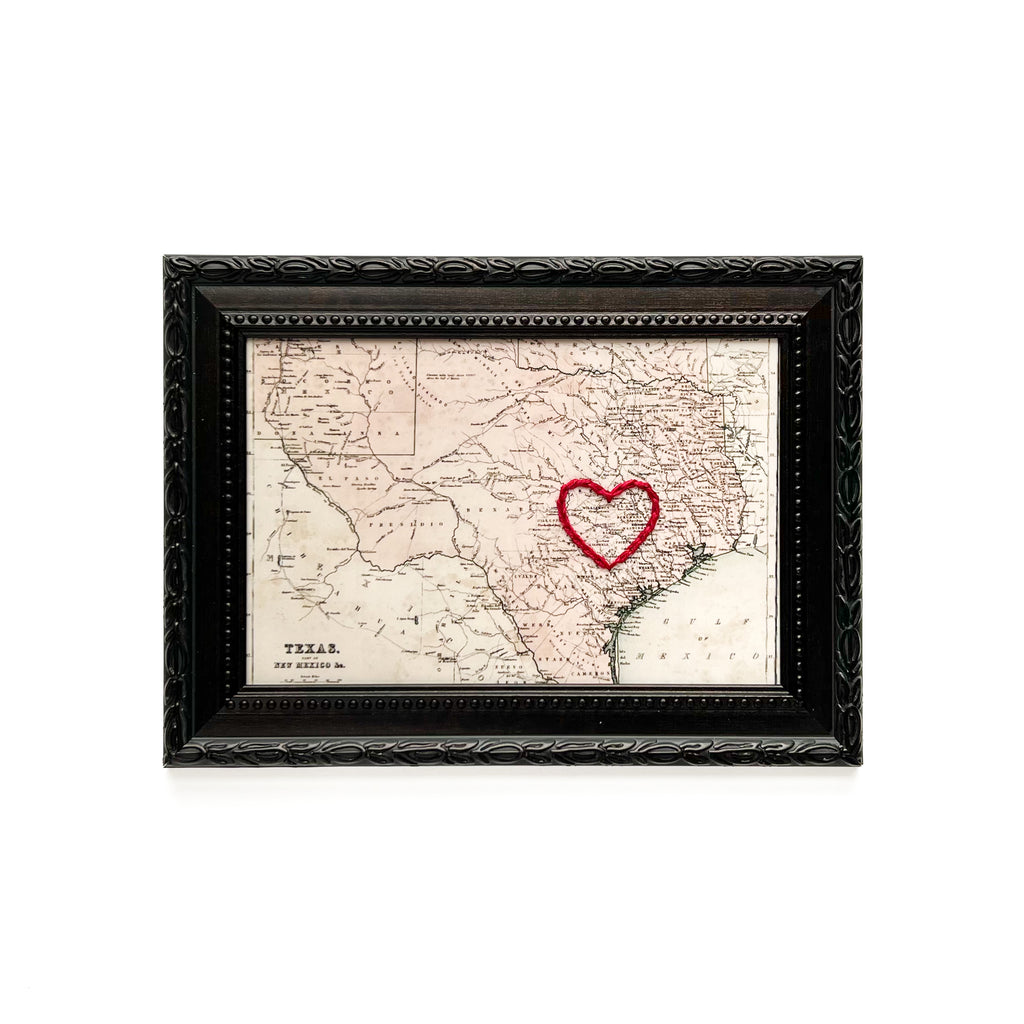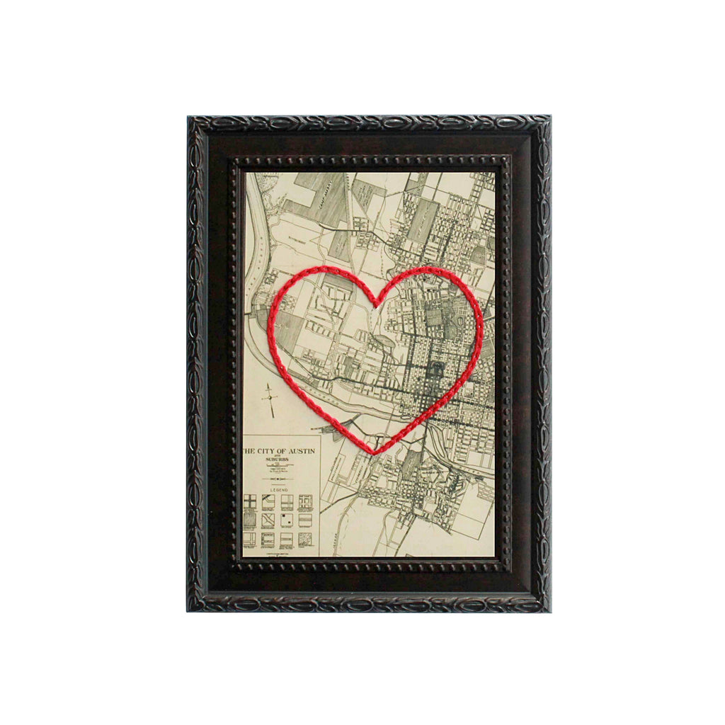 This vintage Austin, Texas map print has been hand-embroidered with a red heart that symbolizes the places, people, and adventures you hold dear.
