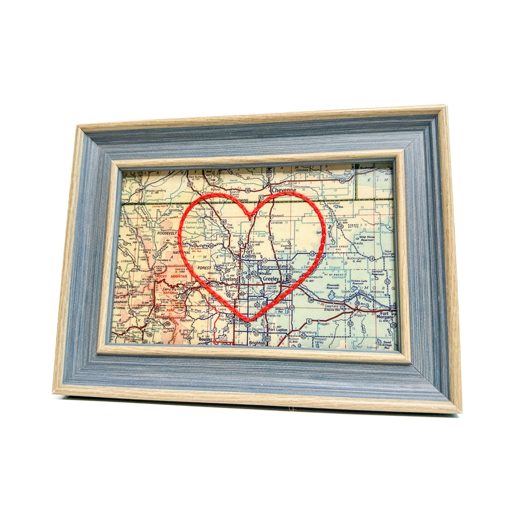 This vintage Fort Collins, Colorado map print has been hand-embroidered with a red heart - symbolizing the places, people, and adventures you hold dear.