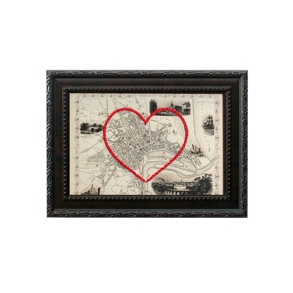 This vintage Aberdeen, Scotland map print has been hand-embroidered with a red heart that symbolizes the places, people, and adventures you hold dear.