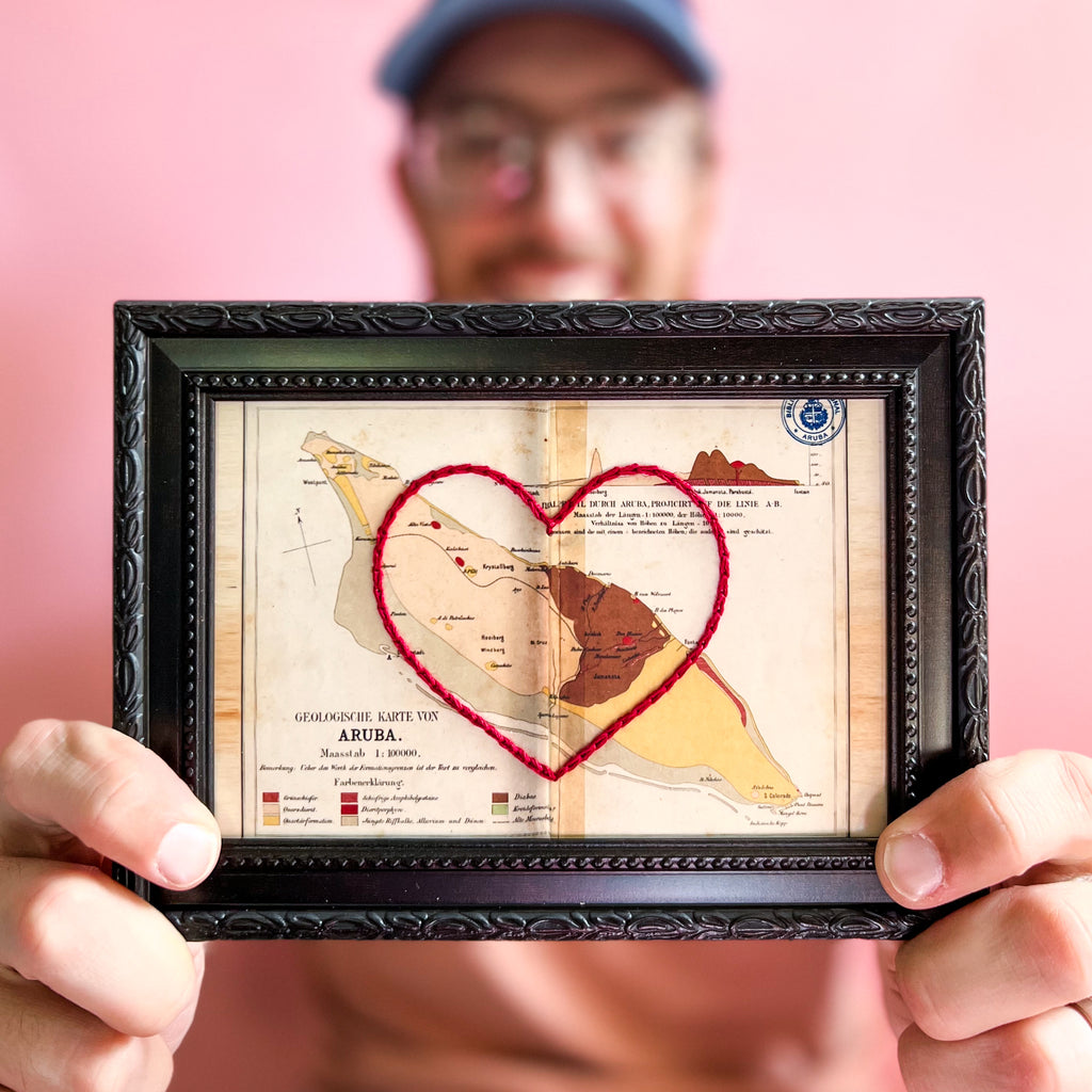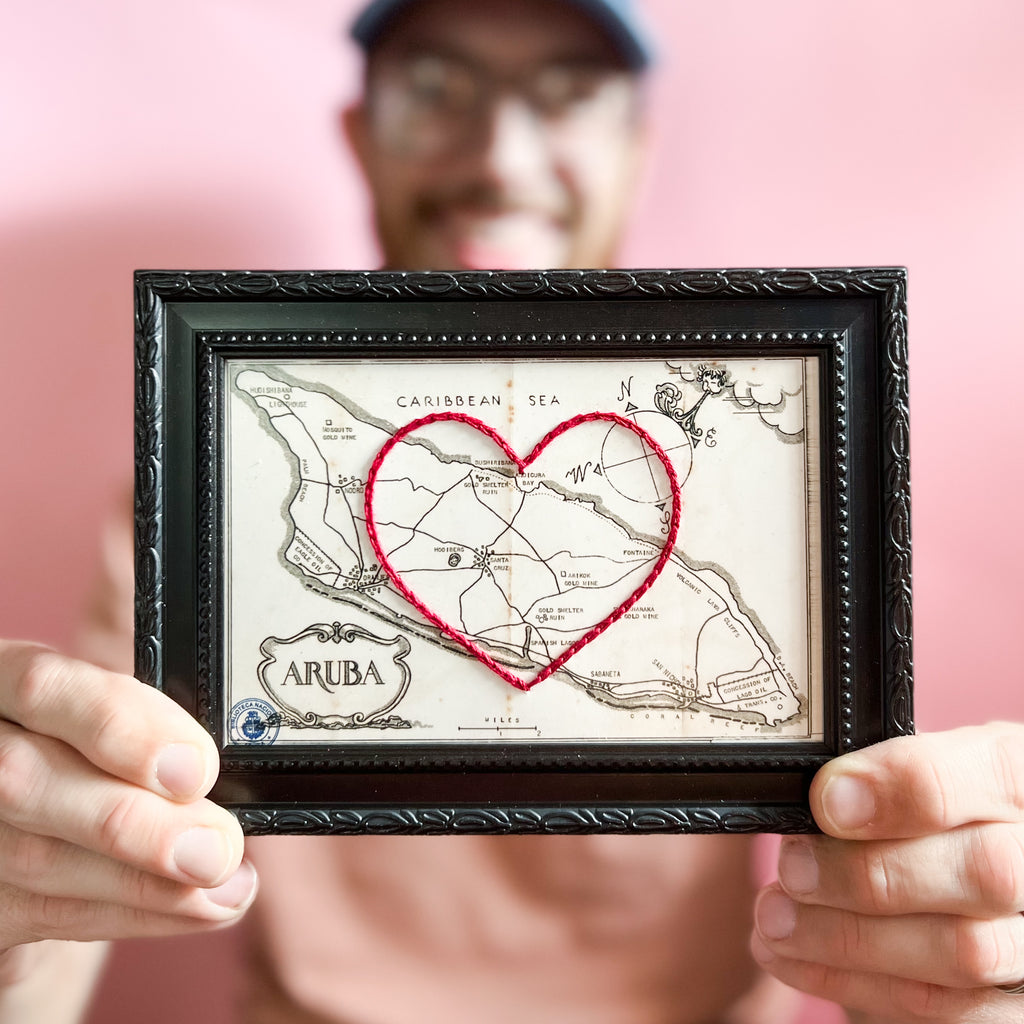 This vintage Aruba map print has been hand-embroidered with a red heart that symbolizes the places, people, and adventures you hold dear.