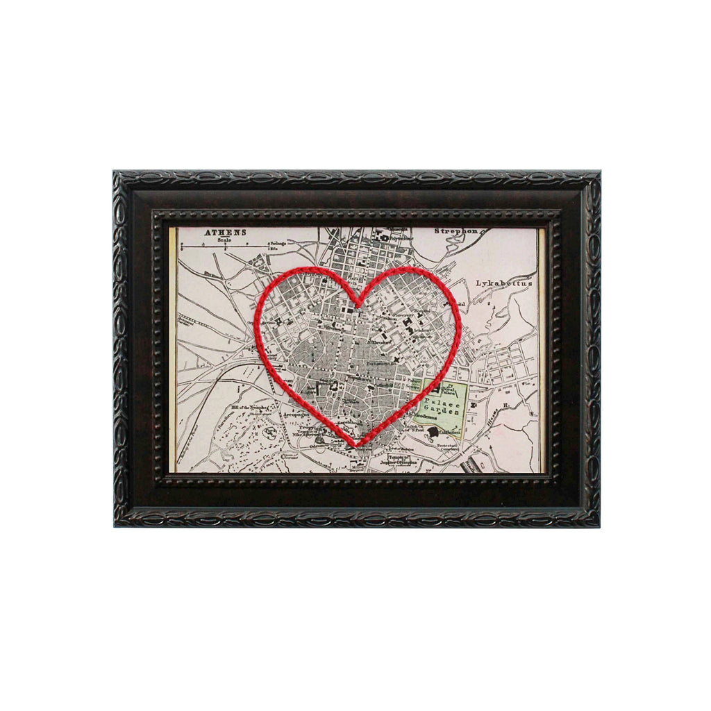 This vintage Athens, Greece map print has been hand-embroidered with a red heart that symbolizes the places, people, and adventures you hold dear.