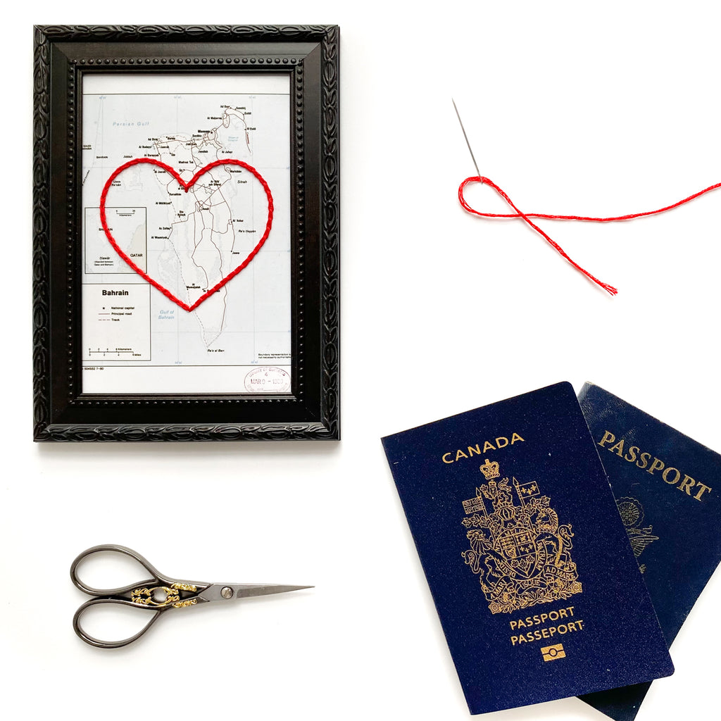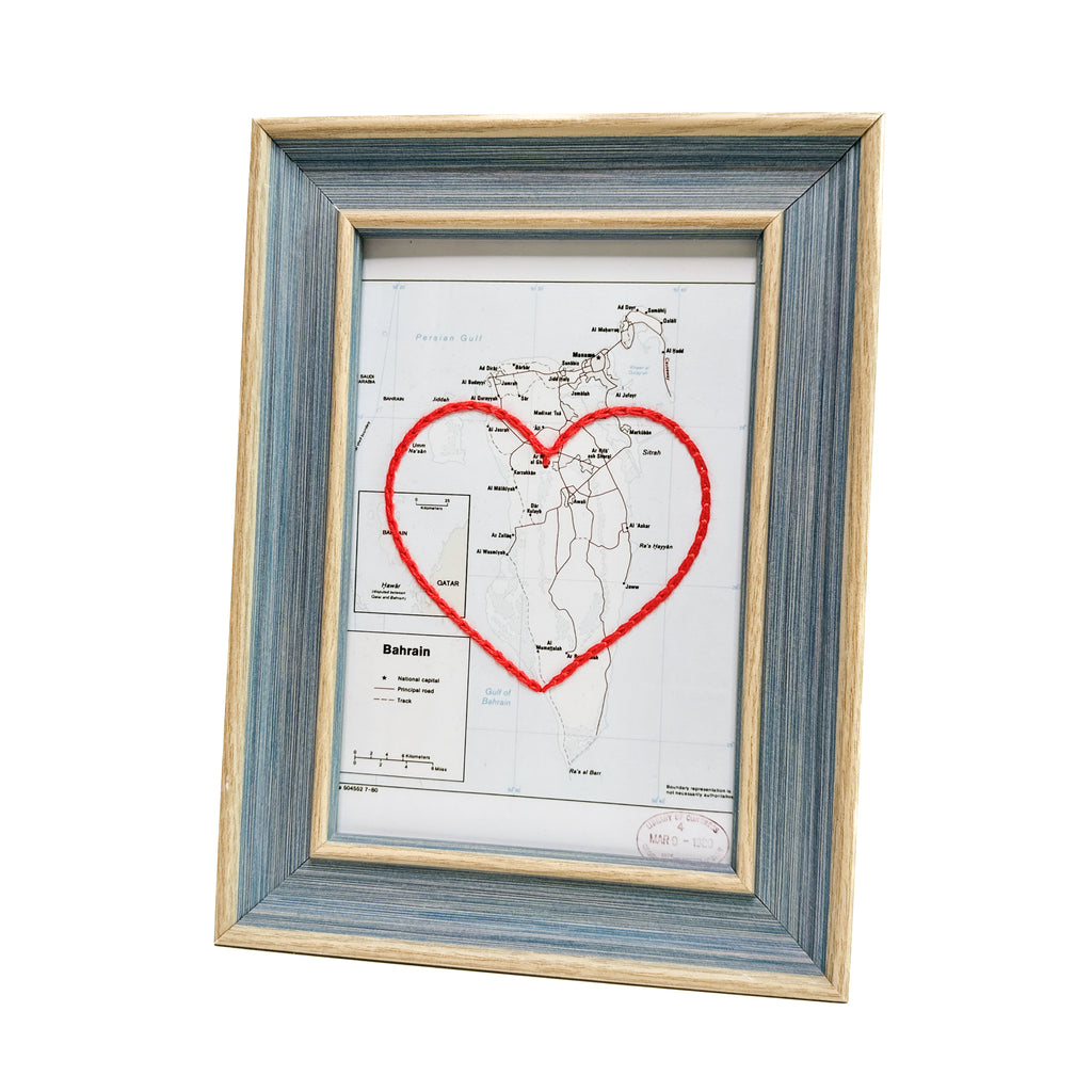 This vintage Bahrain map print has been hand-embroidered with a red heart that symbolizes the places, people, and adventures you hold dear.