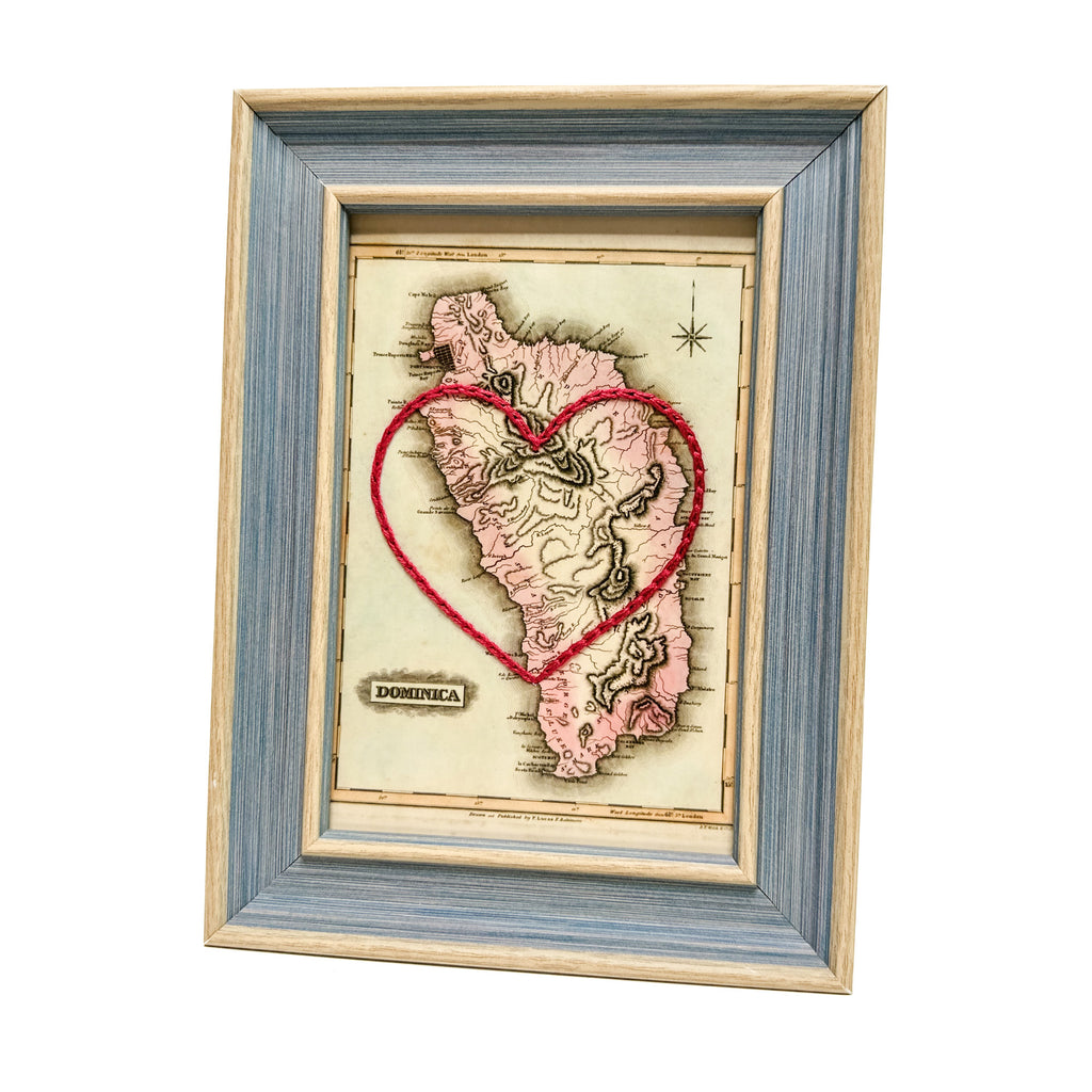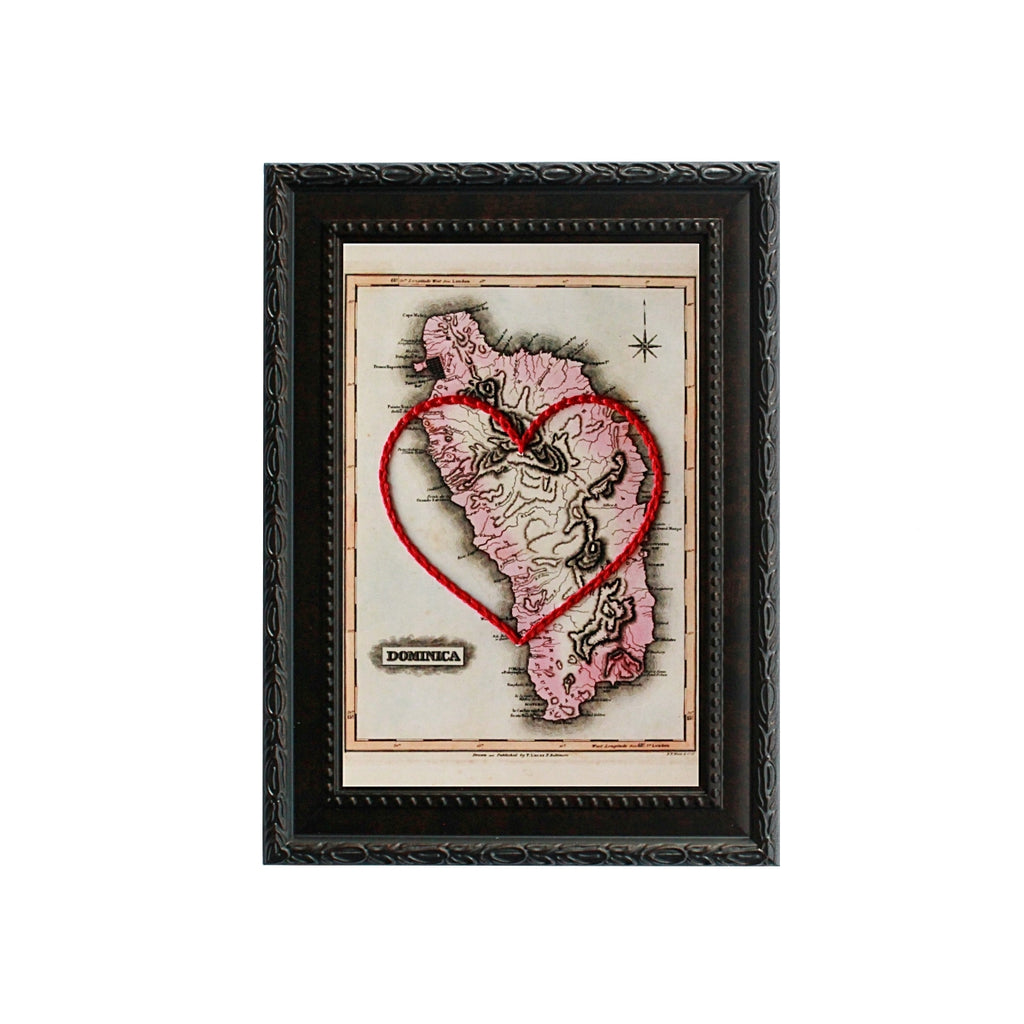 This vintage Dominica map print has been hand-embroidered with a red heart that symbolizes the places, people, and adventures you hold dear.