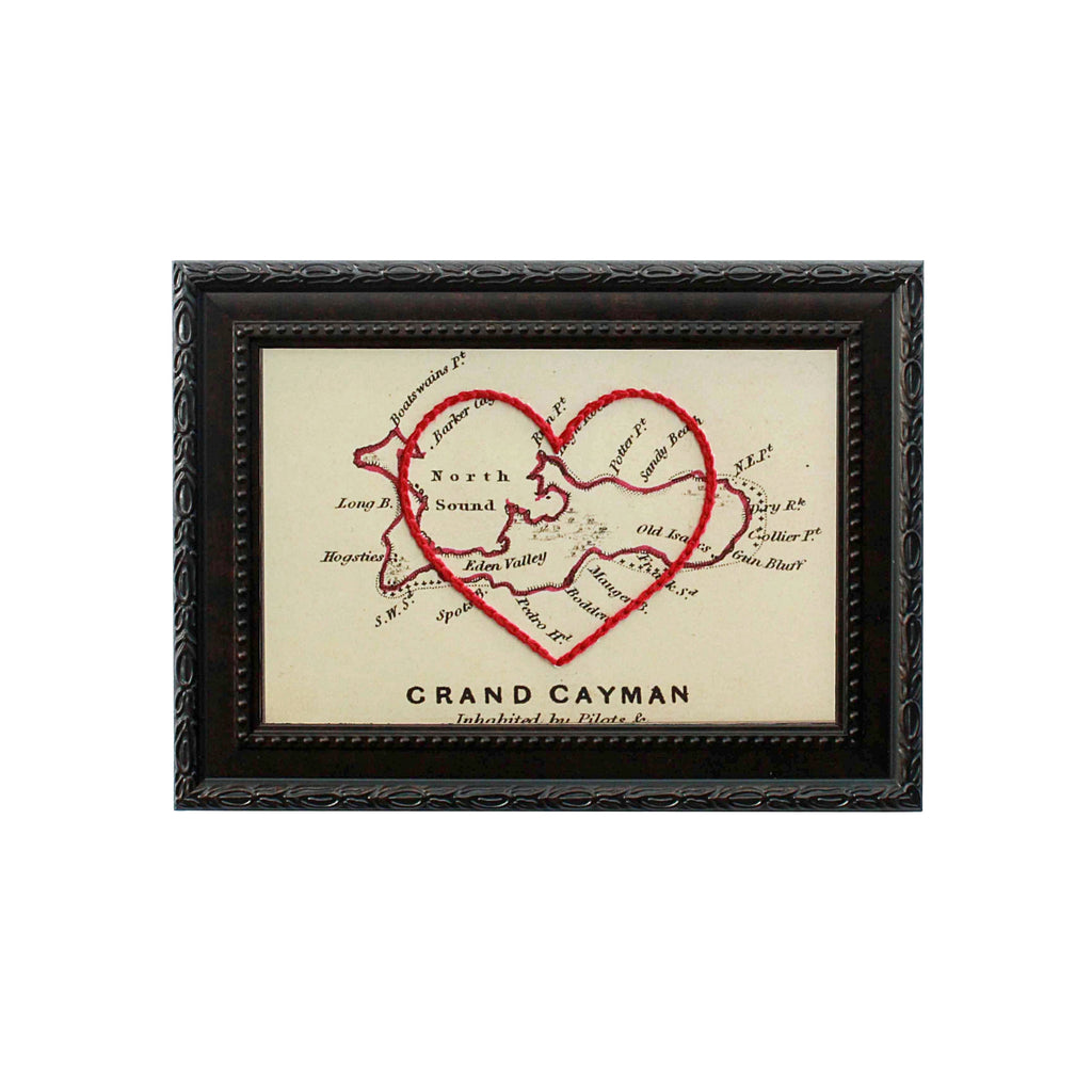 This vintage Grand Cayman Island map print has been hand-embroidered with a red heart that symbolizes the places, people, and adventures you hold dear.
