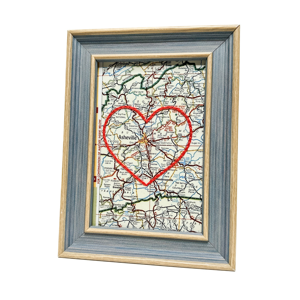 This vintage Asheville, North Carolina map print has been hand-embroidered with a red heart that symbolizes the places, people, and adventures you hold dear.