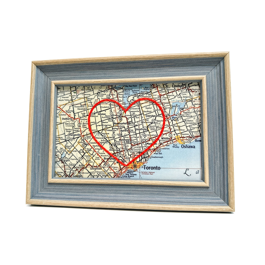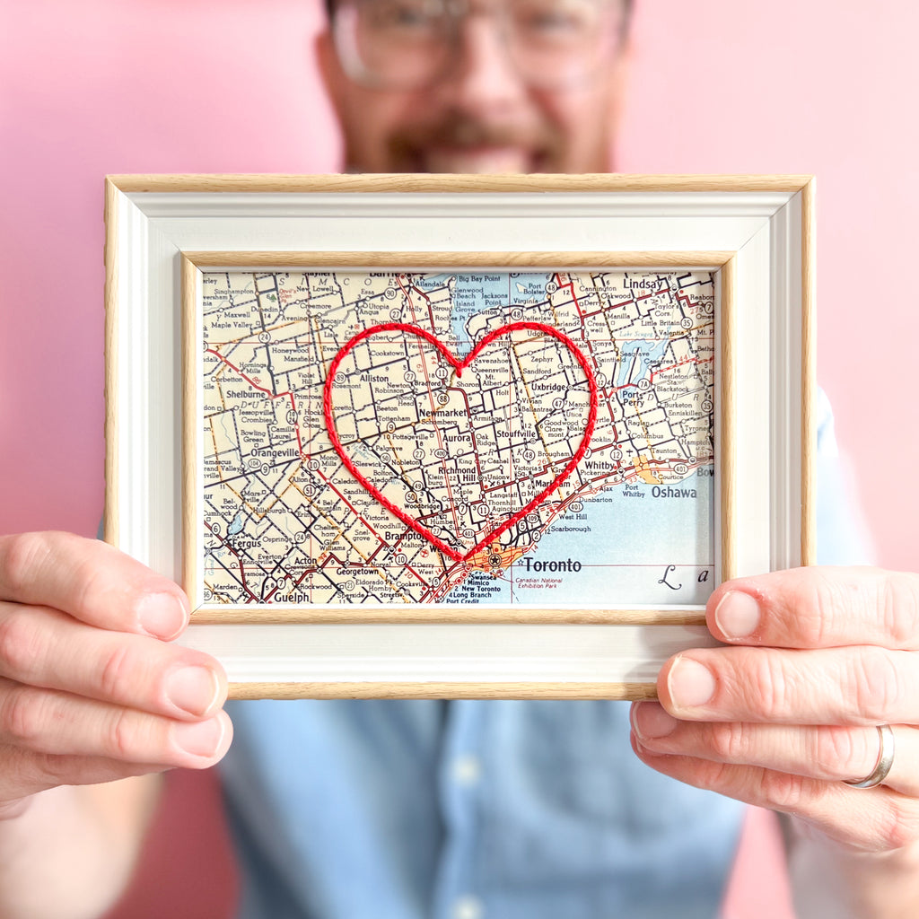 This vintage Aurora, Ontario map print has been hand-embroidered with a red heart that symbolizes the places, people, and adventures you hold dear.