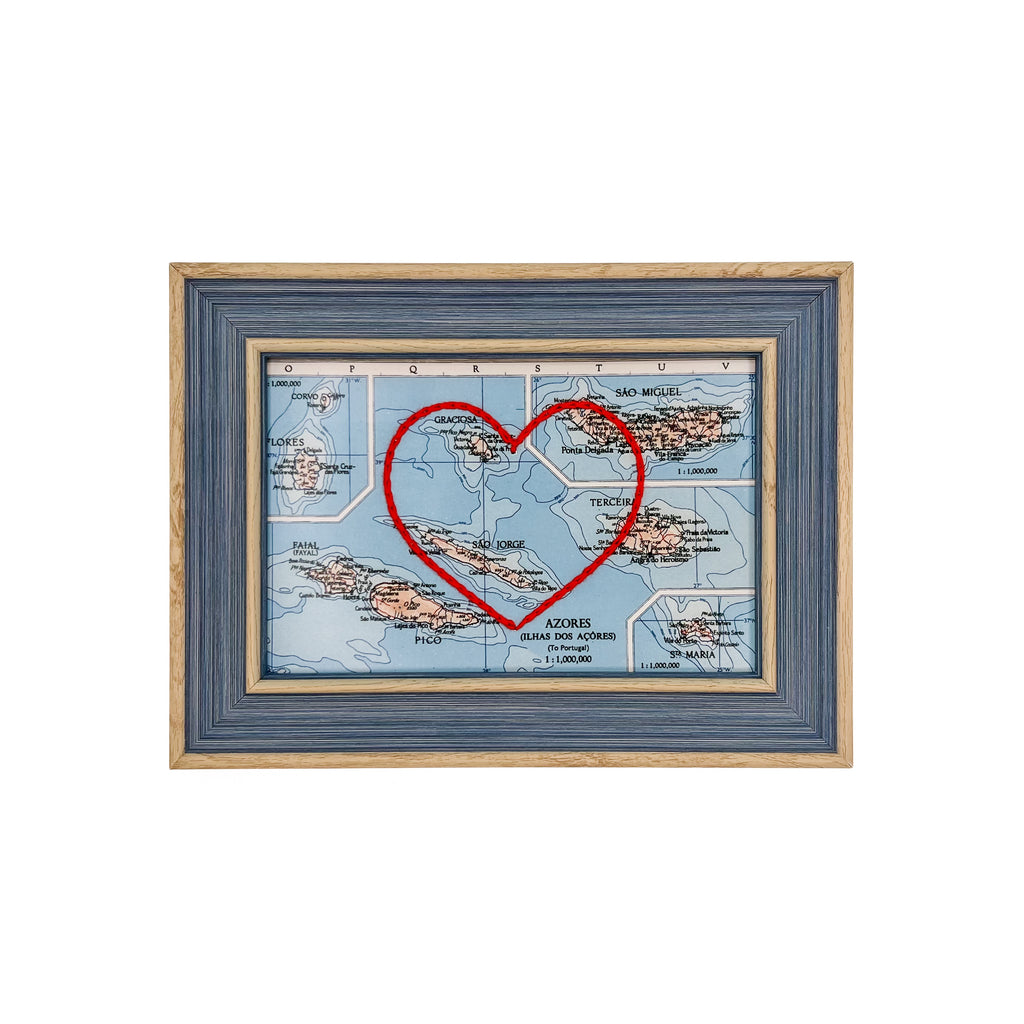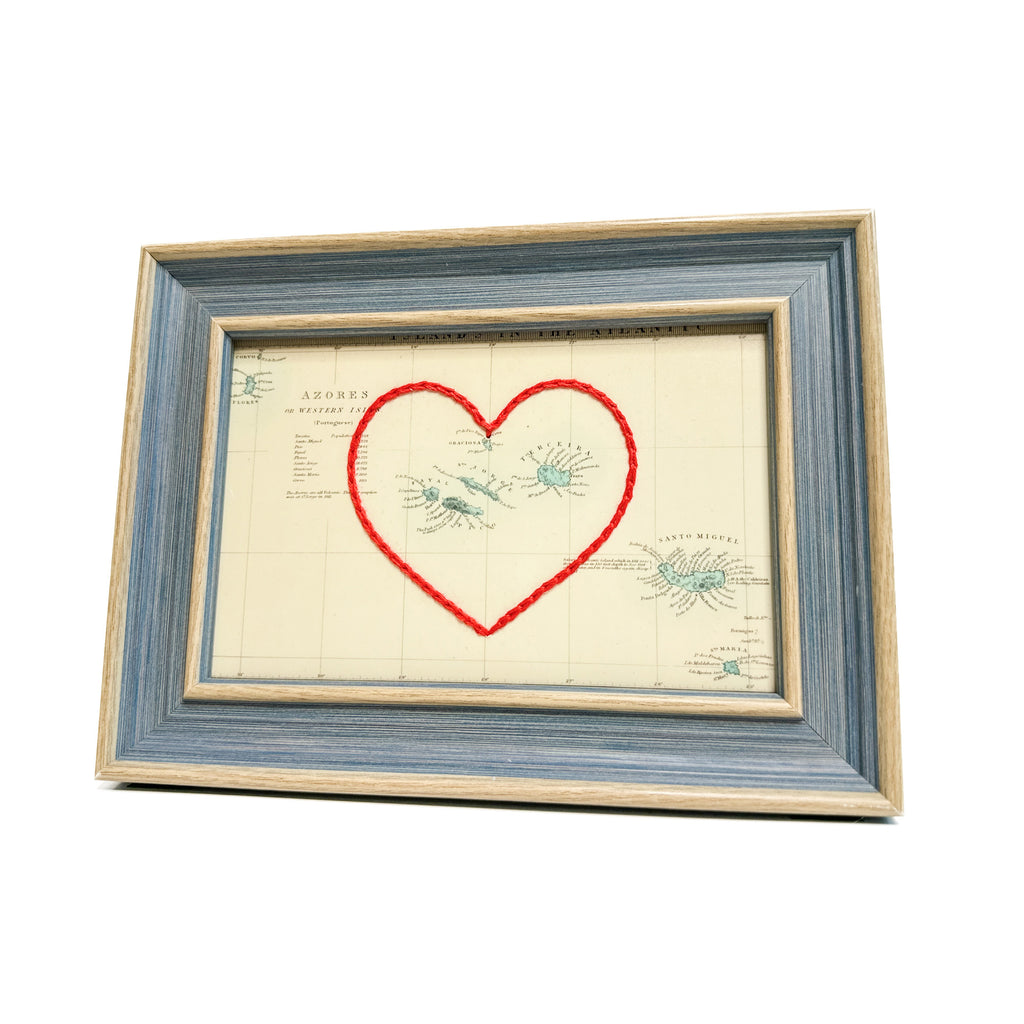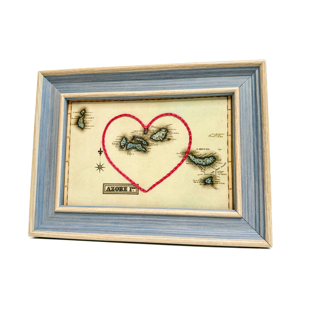 This vintage Azores Islands map print has been hand-embroidered with a red heart that symbolizes the places, people, and adventures you hold dear.