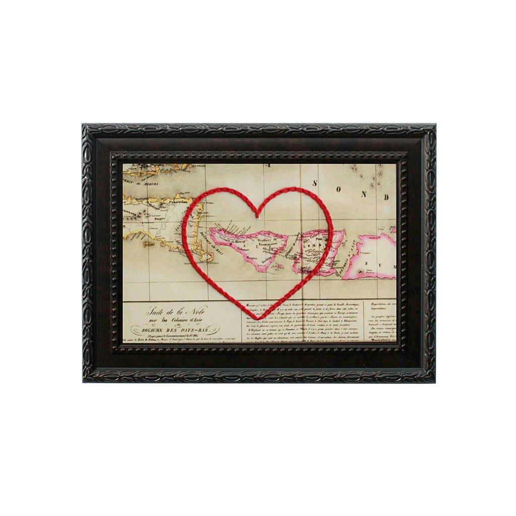 This vintage Bali, Indonesia map print has been hand-embroidered with a red heart that symbolizes the places, people, and adventures you hold dear.
