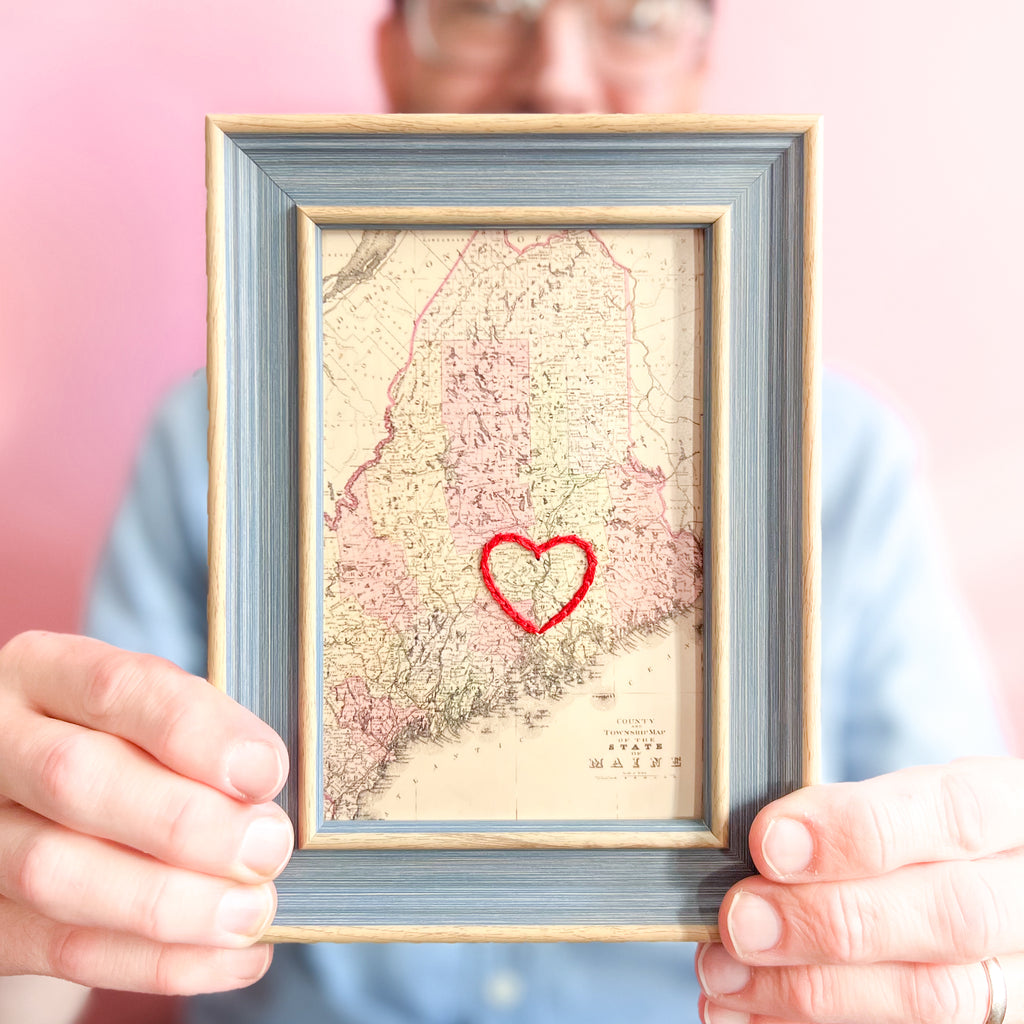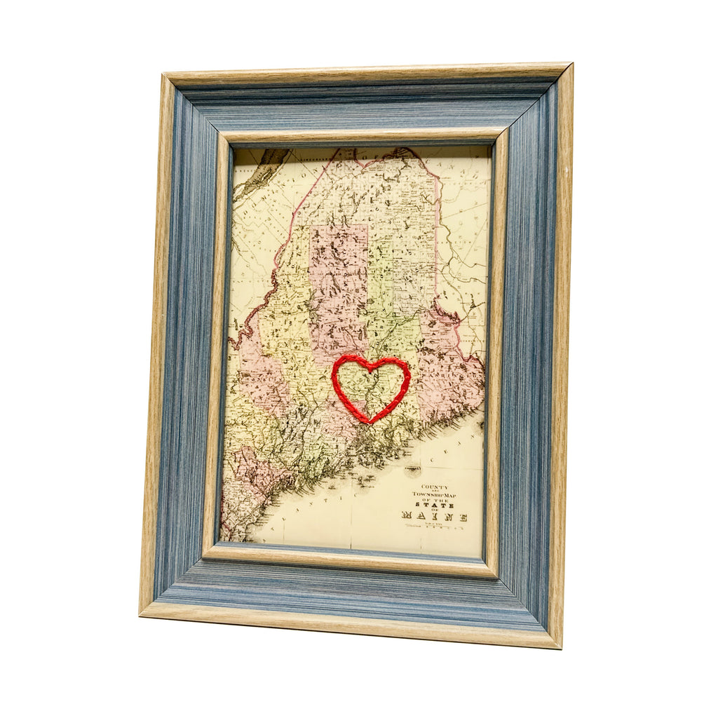 This vintage Maine map print has been hand-embroidered with a red heart around Bangor that symbolizes the places, people, and adventures you hold dear.