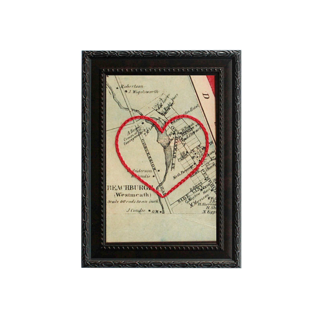 This vintage Beachburg, Ontario map print has been hand-embroidered with a red heart that symbolizes the places, people, and adventures you hold dear.