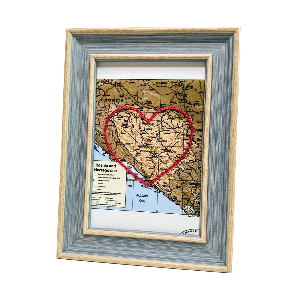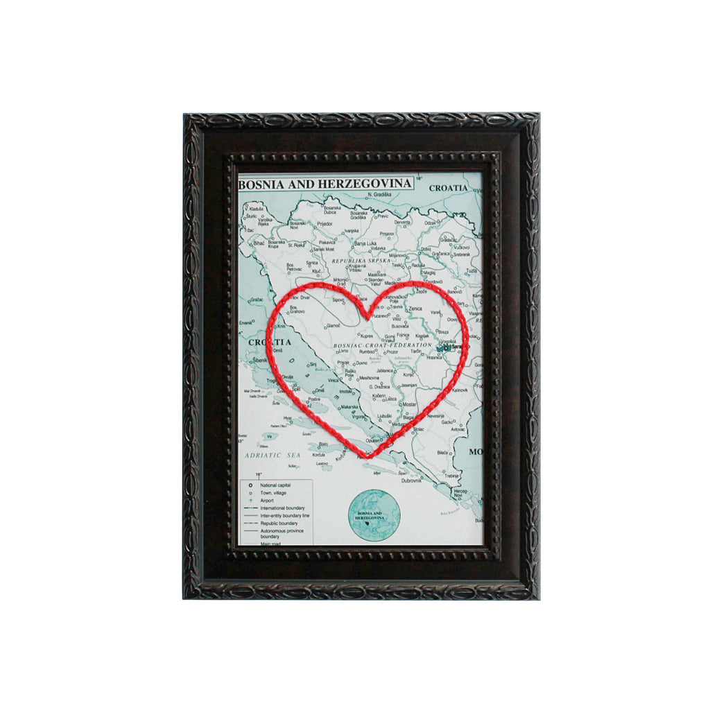 Framed and Ready to Gift: This Bosnia and Herzegovina Heart Map is framed for your convenience in a complimentary vintage-inspired frame of your choosing! See product photos for options. All frames can be hung or displayed on a wall or shelf - whichever suits the owner best (except 11x14 frames - which can only be hung).