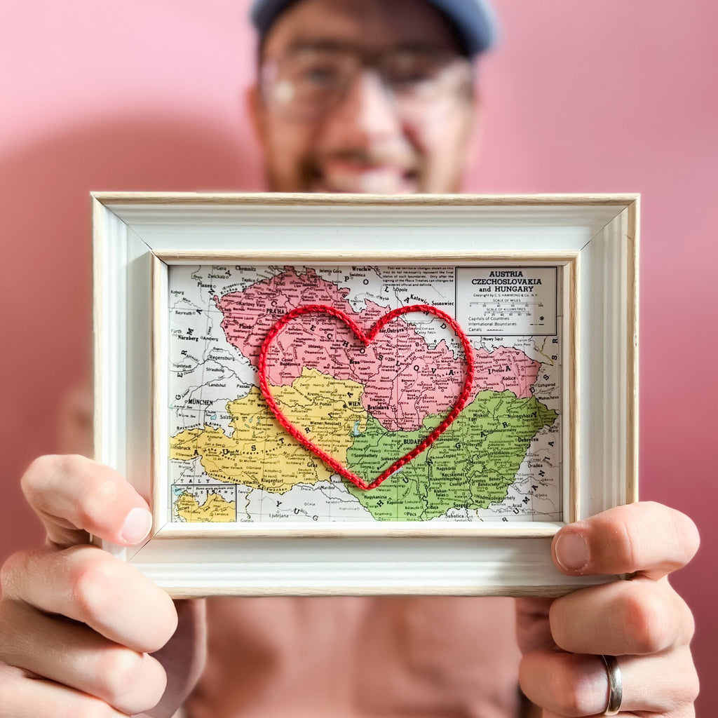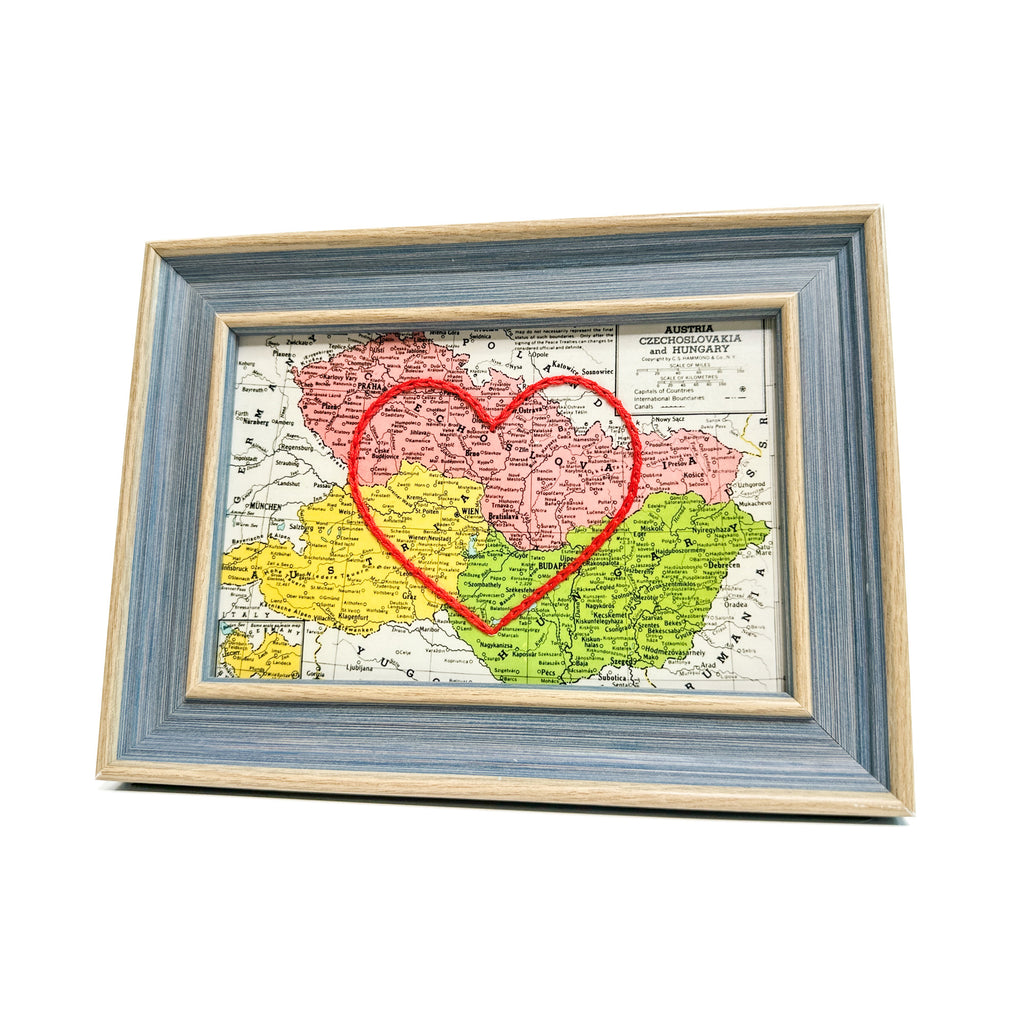 This vintage Bratislava, Slovakia map print has been hand-embroidered with a red heart that symbolizes the places, people, and adventures you hold dear.
