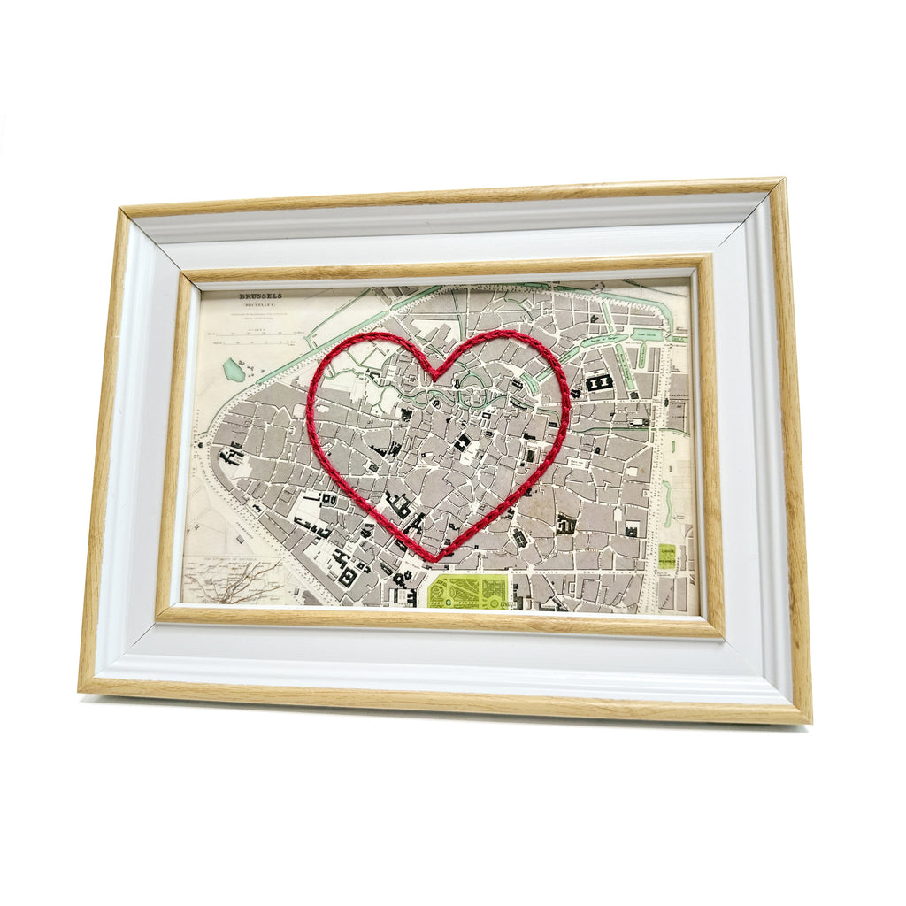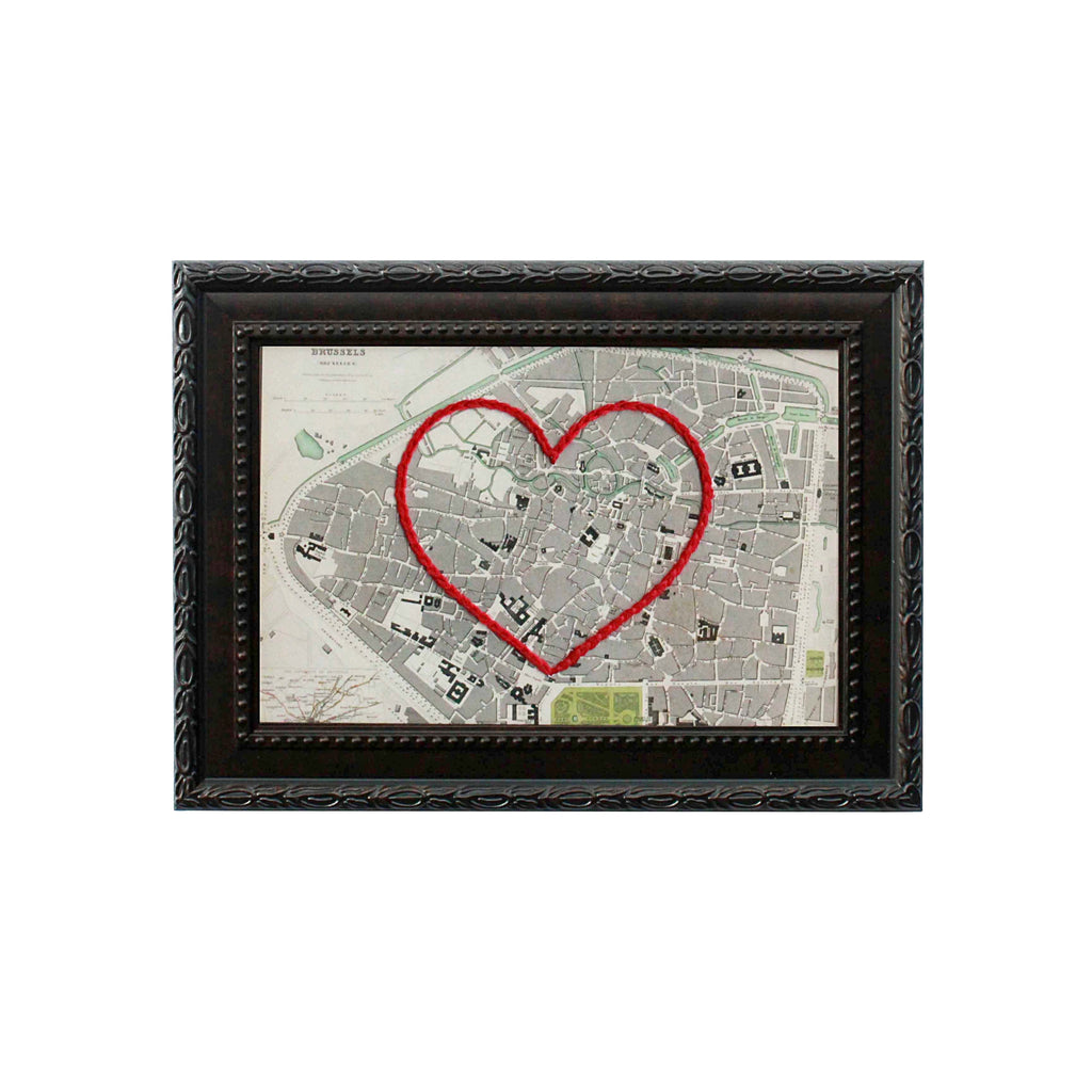 This vintage Brussels, Belgium map print has been hand-embroidered with a red heart that symbolizes the places, people, and adventures you hold dear.
