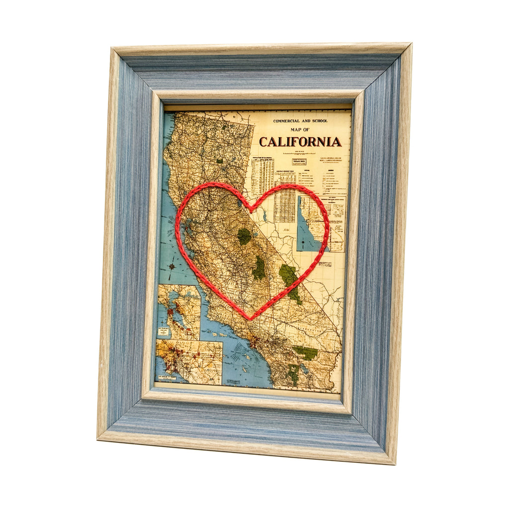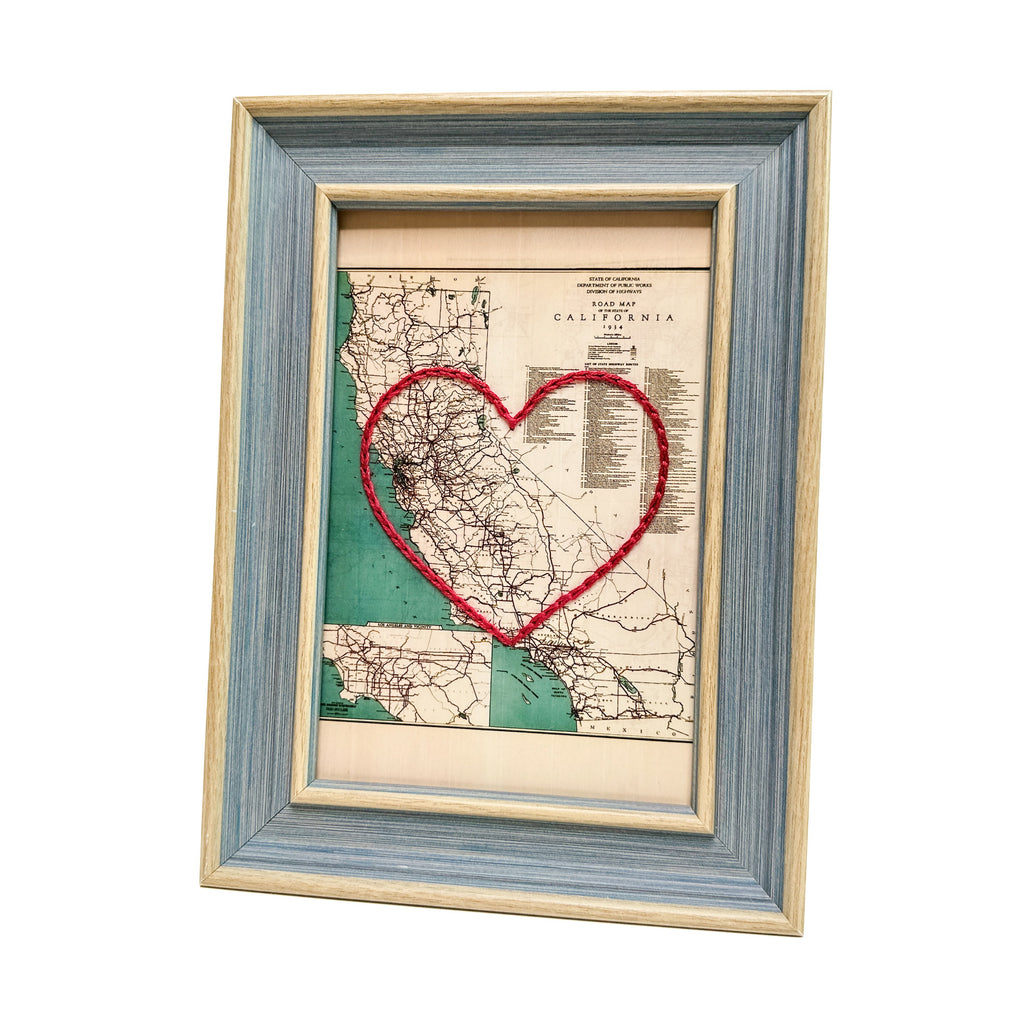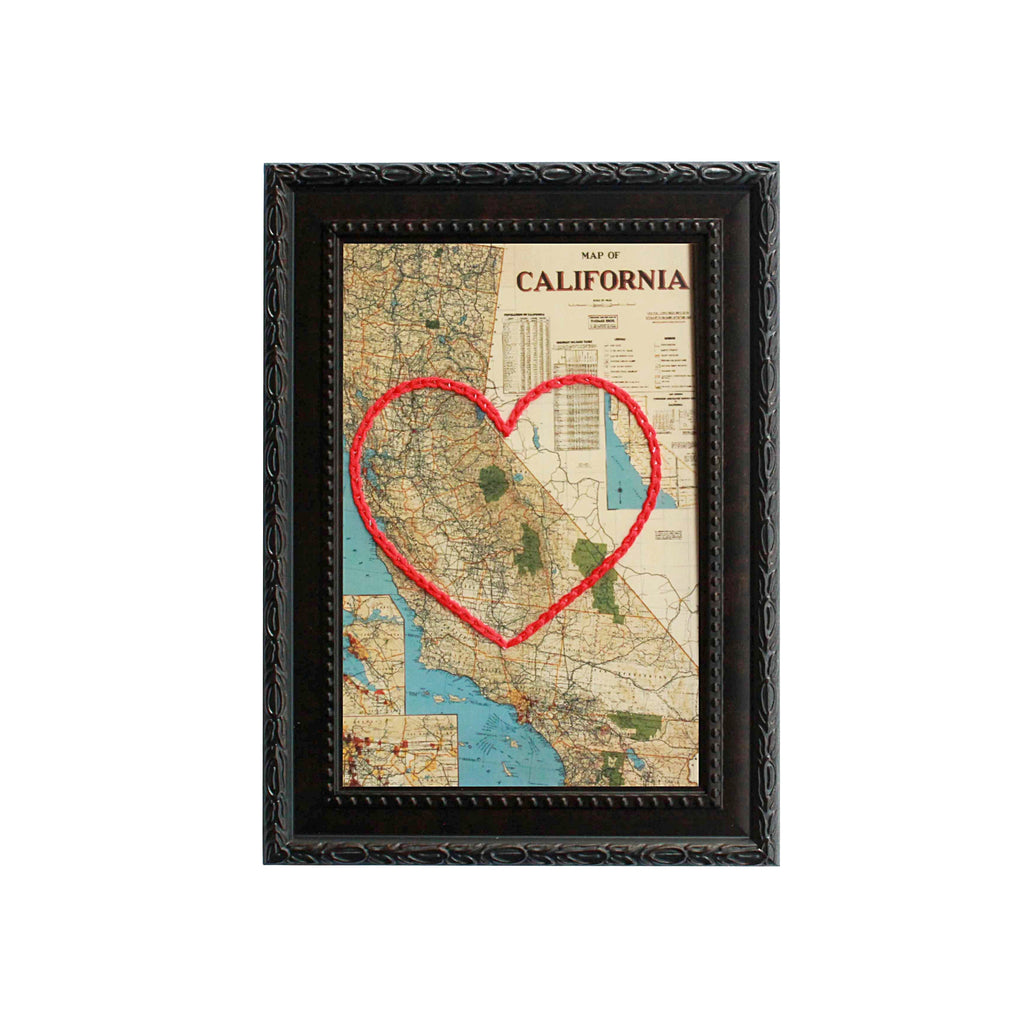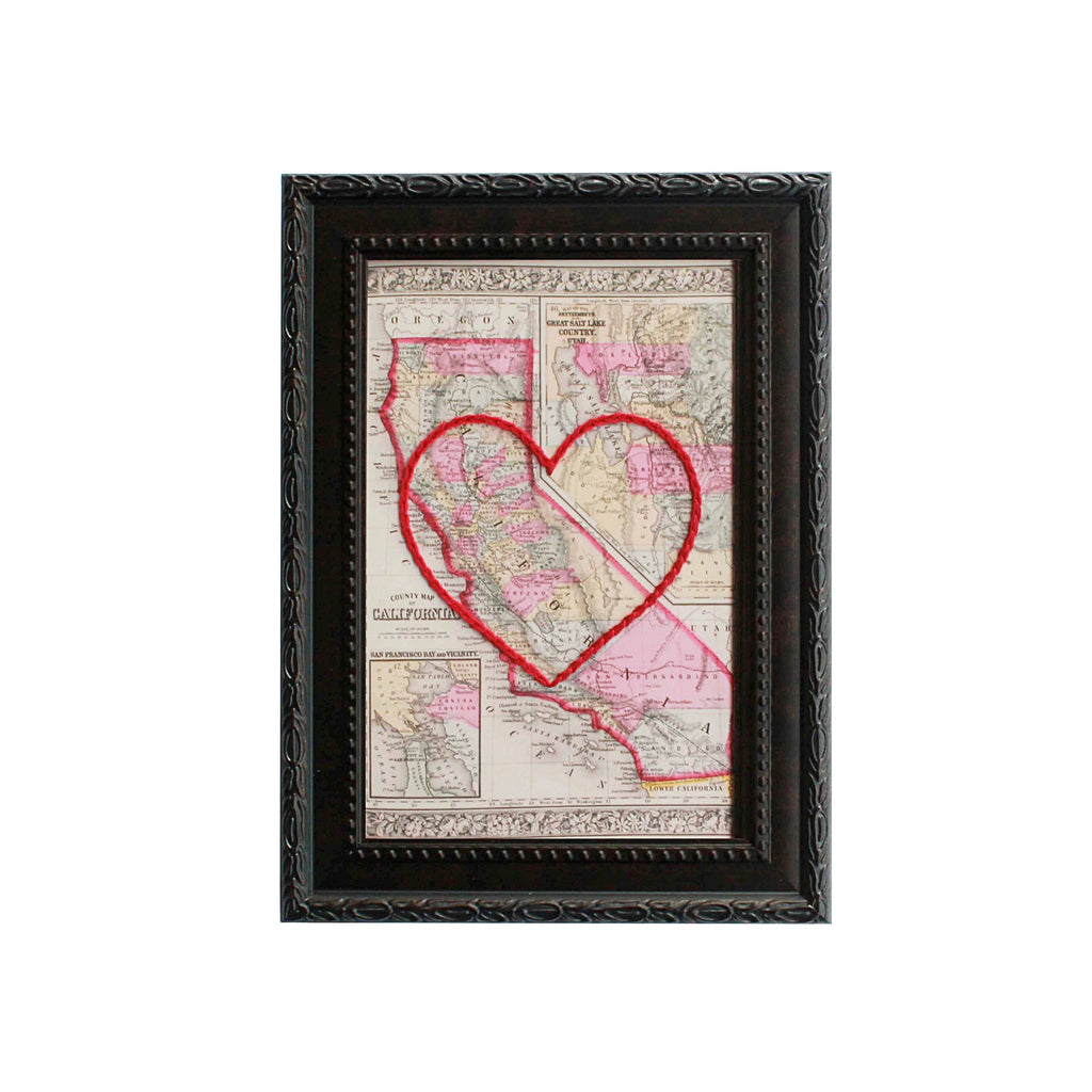 This vintage California map print has been hand-embroidered with a red heart that symbolizes the places, people, and adventures you hold dear.