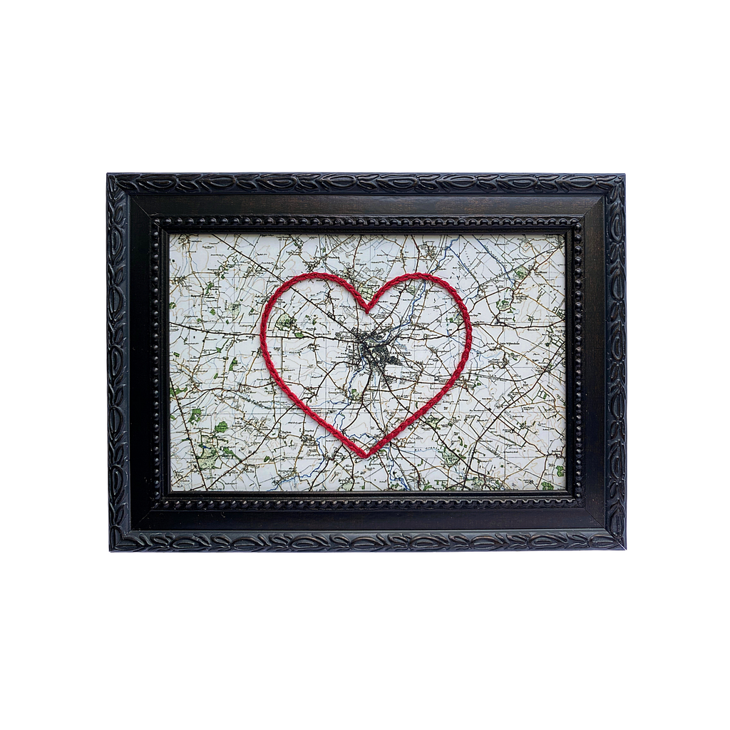 This vintage Cambridge, England map print has been hand-embroidered with a red heart that symbolizes the places, people, and adventures you hold dear.