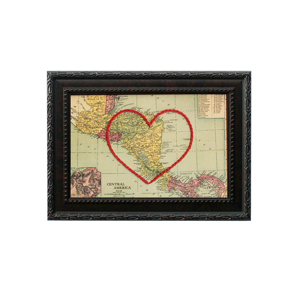 This vintage Central America map print has been hand-embroidered with a red heart that symbolizes the places, people, and adventures you hold dear.