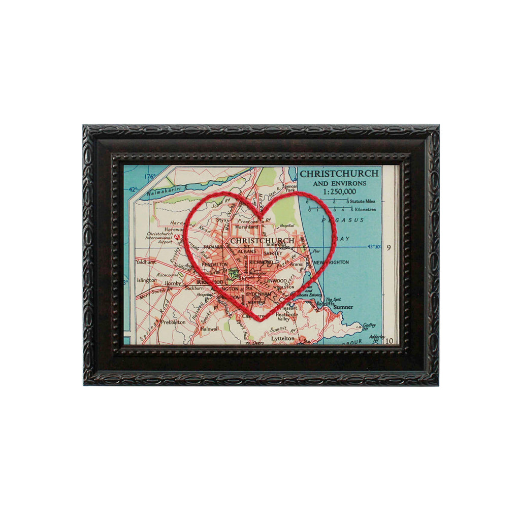 This vintage Christchurch, New Zealand map print has been hand-embroidered with a red heart that symbolizes the places, people, and adventures you hold dear.