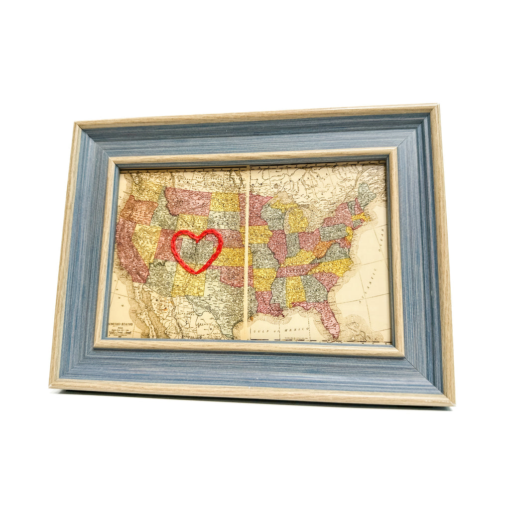 This vintage Colorado map print has been hand-embroidered with a red heart that symbolizes the places, people, and adventures you hold dear.