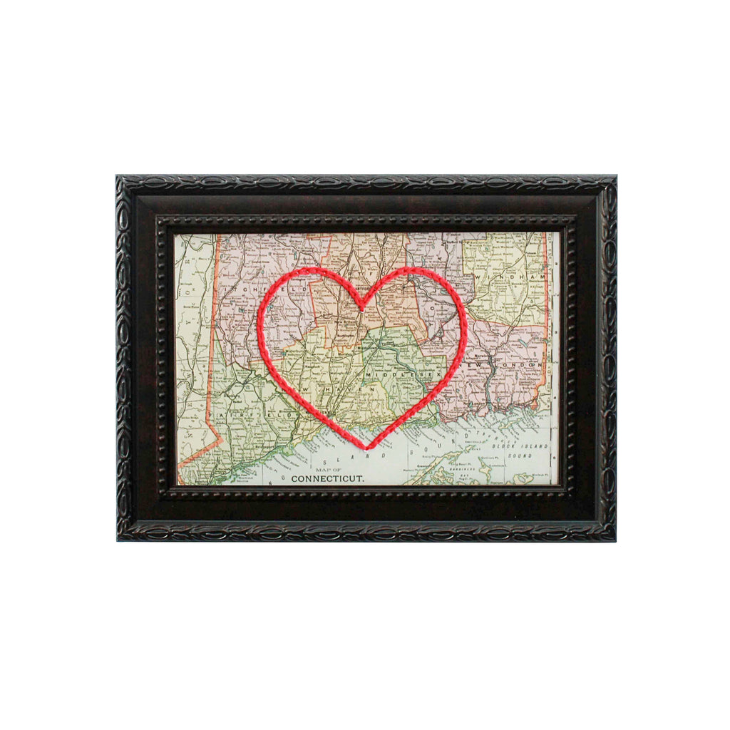 This vintage Connecticut map print has been hand-embroidered with a red heart that symbolizes the places, people, and adventures you hold dear.