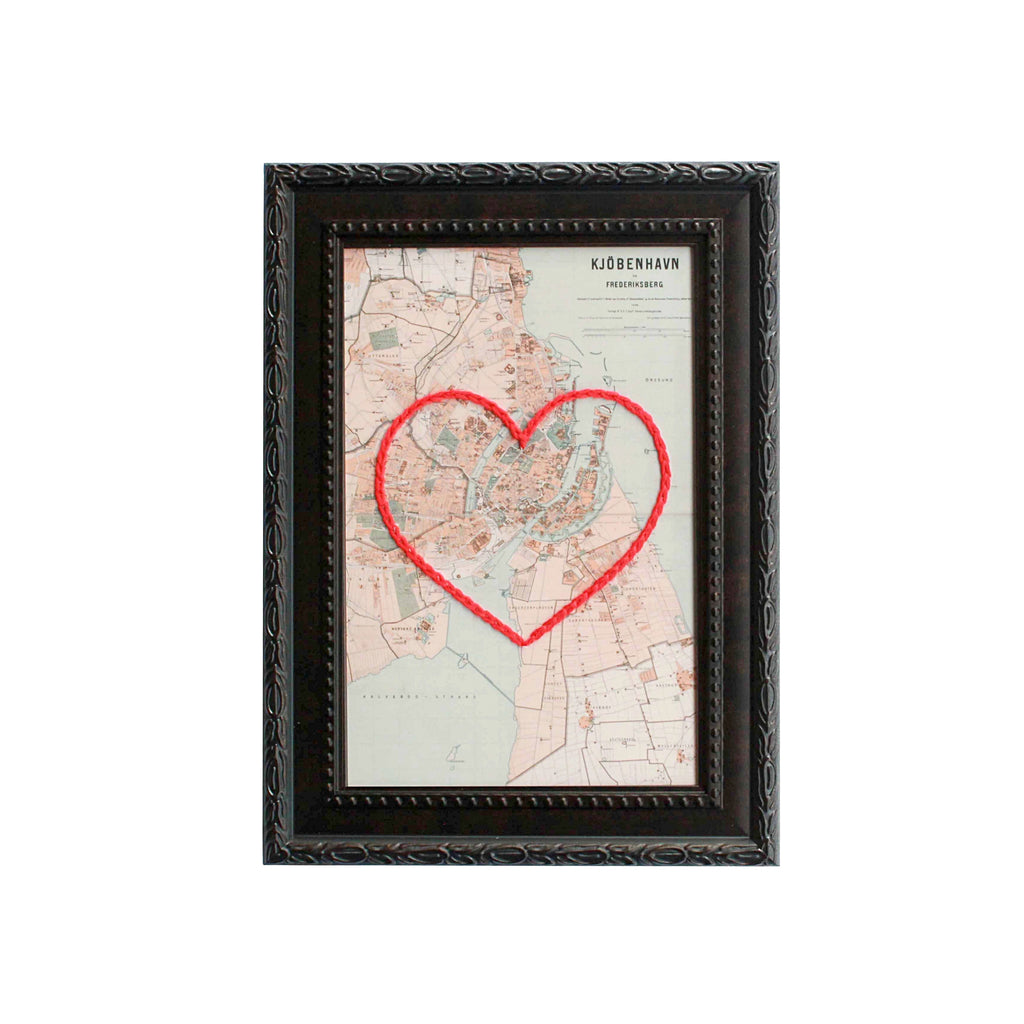 This vintage Copenhagen, Denmark map print has been hand-embroidered with a red heart that symbolizes the places, people, and adventures you hold dear.