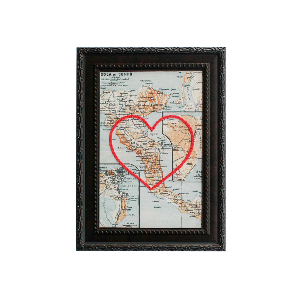 This vintage Corfu, Greece map print has been hand-embroidered with a red heart that symbolizes the places, people, and adventures you hold dear.
