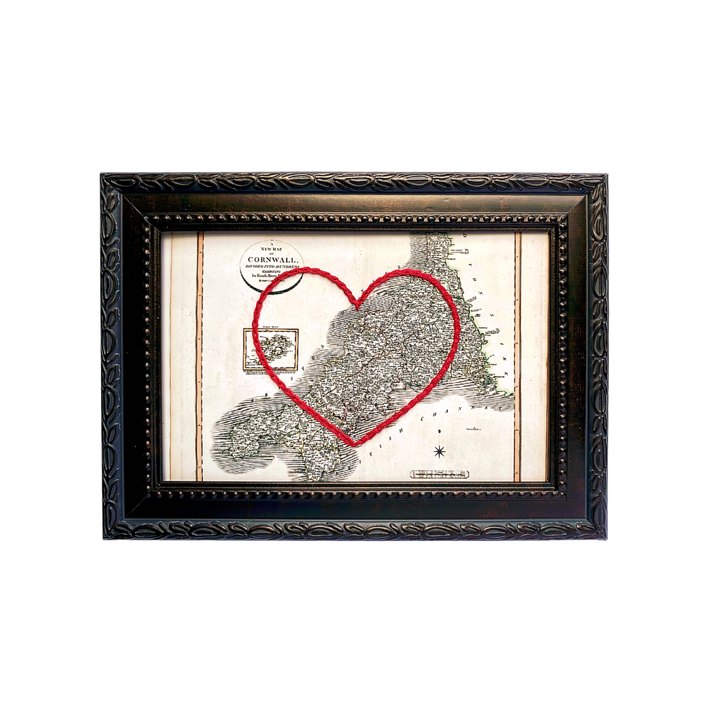 This vintage Cornwall, England map print has been hand-embroidered with a red heart that symbolizes the places, people, and adventures you hold dear.