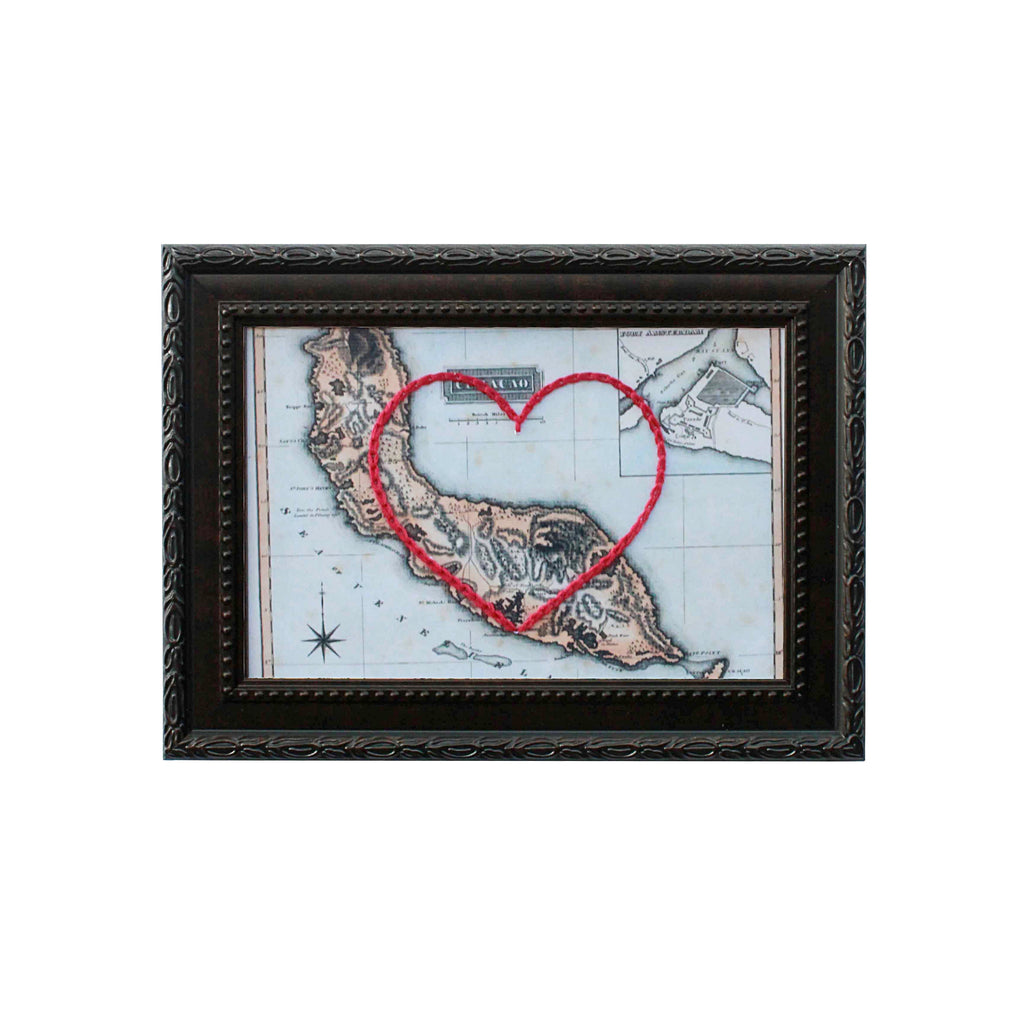 This vintage Curacao map print has been hand-embroidered with a red heart that symbolizes the places, people, and adventures you hold dear.