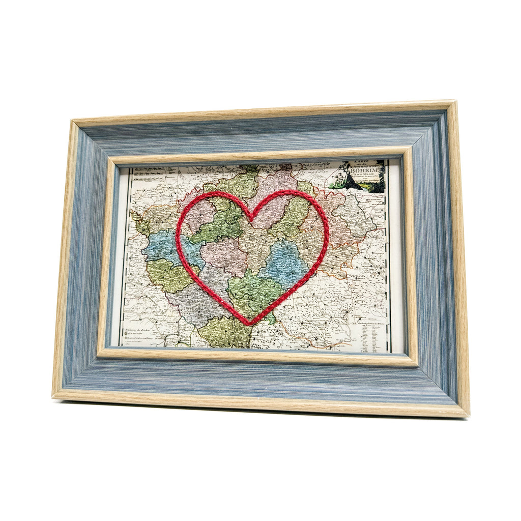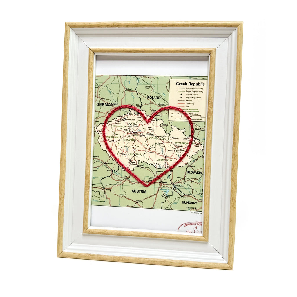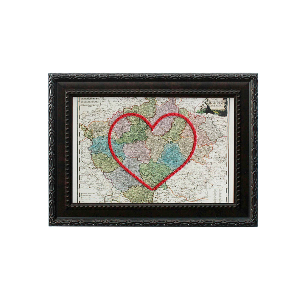 This vintage Czech Republic map print has been hand-embroidered with a red heart that symbolizes the places, people, and adventures you hold dear.