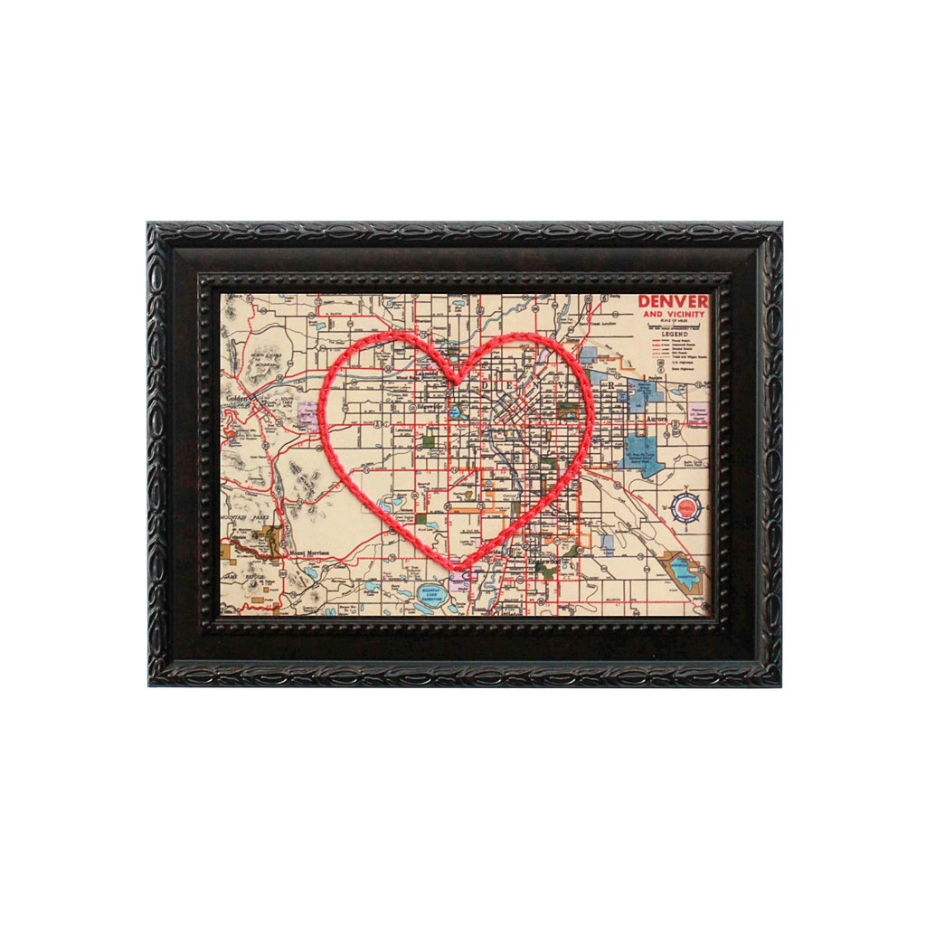 This vintage Denver, Colorado map print has been hand-embroidered with a red heart that symbolizes the places, people, and adventures you hold dear.