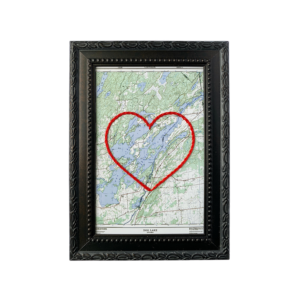 This vintage Dog Lake, Ontario map print has been hand-embroidered with a red heart that symbolizes the places, people, and adventures you hold dear.