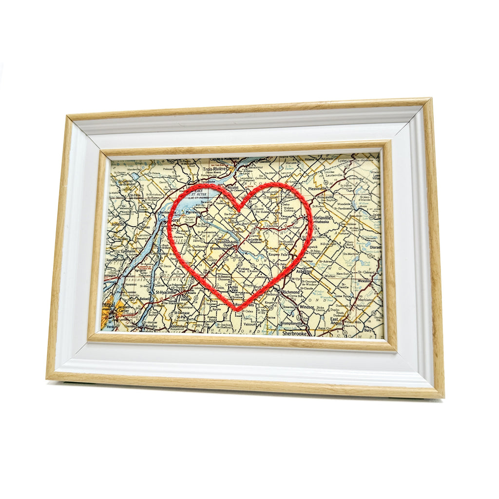This vintage Drummondville, Quebec map print has been hand-embroidered with a red heart that symbolizes the places, people, and adventures you hold dear.