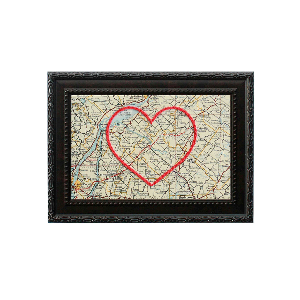 Framed and Ready to Gift: This Drummondville Heart Map is framed for your convenience in a complimentary vintage-inspired frame of your choosing! See product photos for options. All frames can be hung or displayed on a wall or shelf - whichever suits the owner best (except 11x14 frames - which can only be hung).