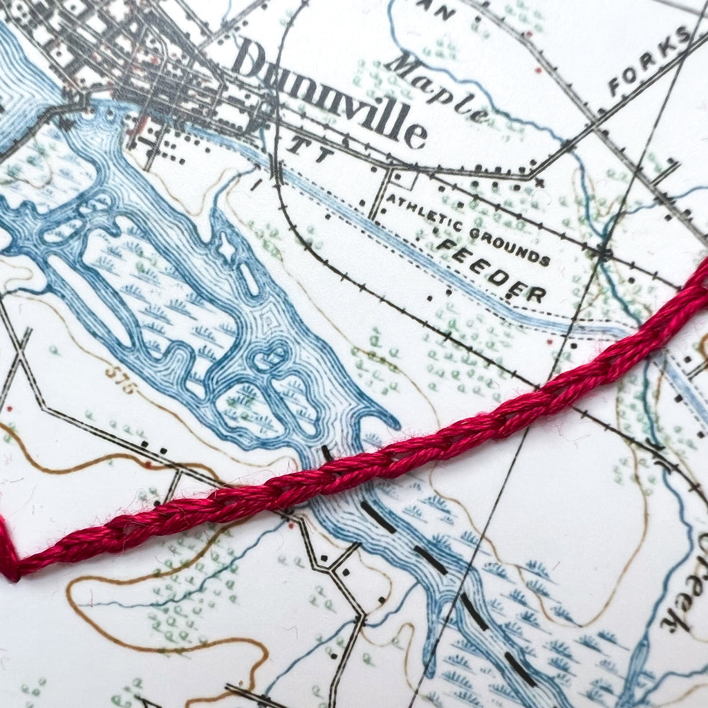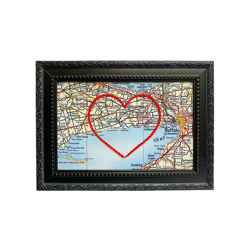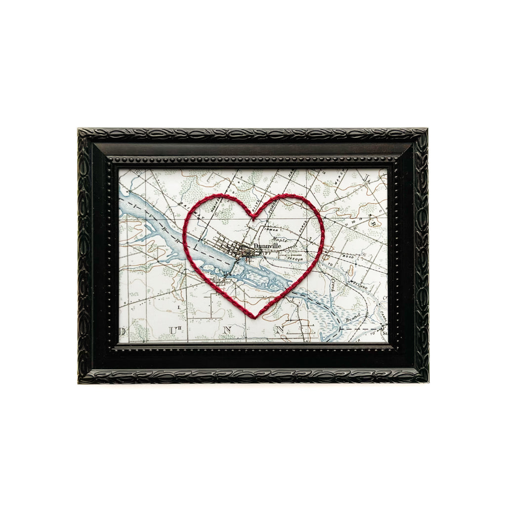 This vintage Dunnville, Ontario map print has been hand-embroidered with a red heart that symbolizes the places, people, and adventures you hold dear.